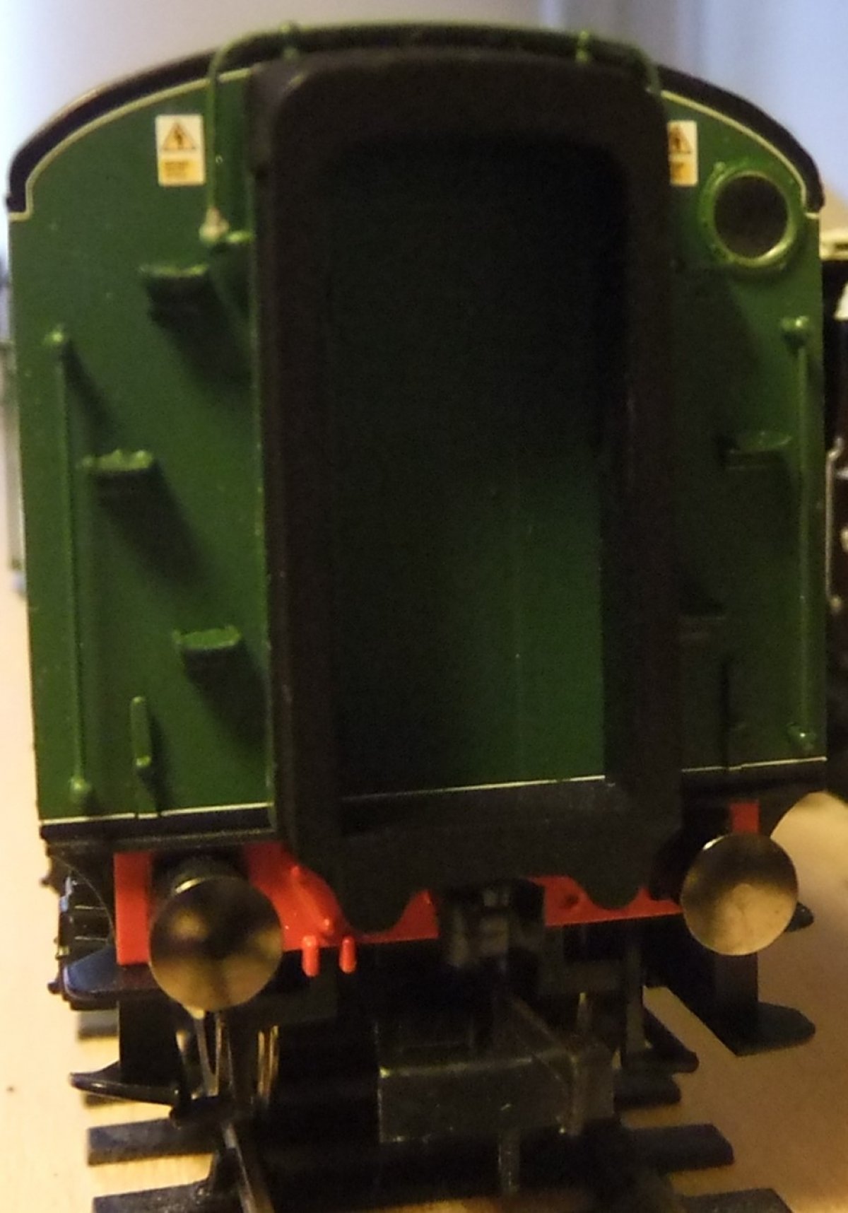 Nadeel: soms draaien de middelste wielen niet rond en in dit geval staat de tender te hoog op de poten, waarschijnlijk omdat de middelste wielen vanwege de constructie van het chassis niet nog verder omhooggetild mogen worden..