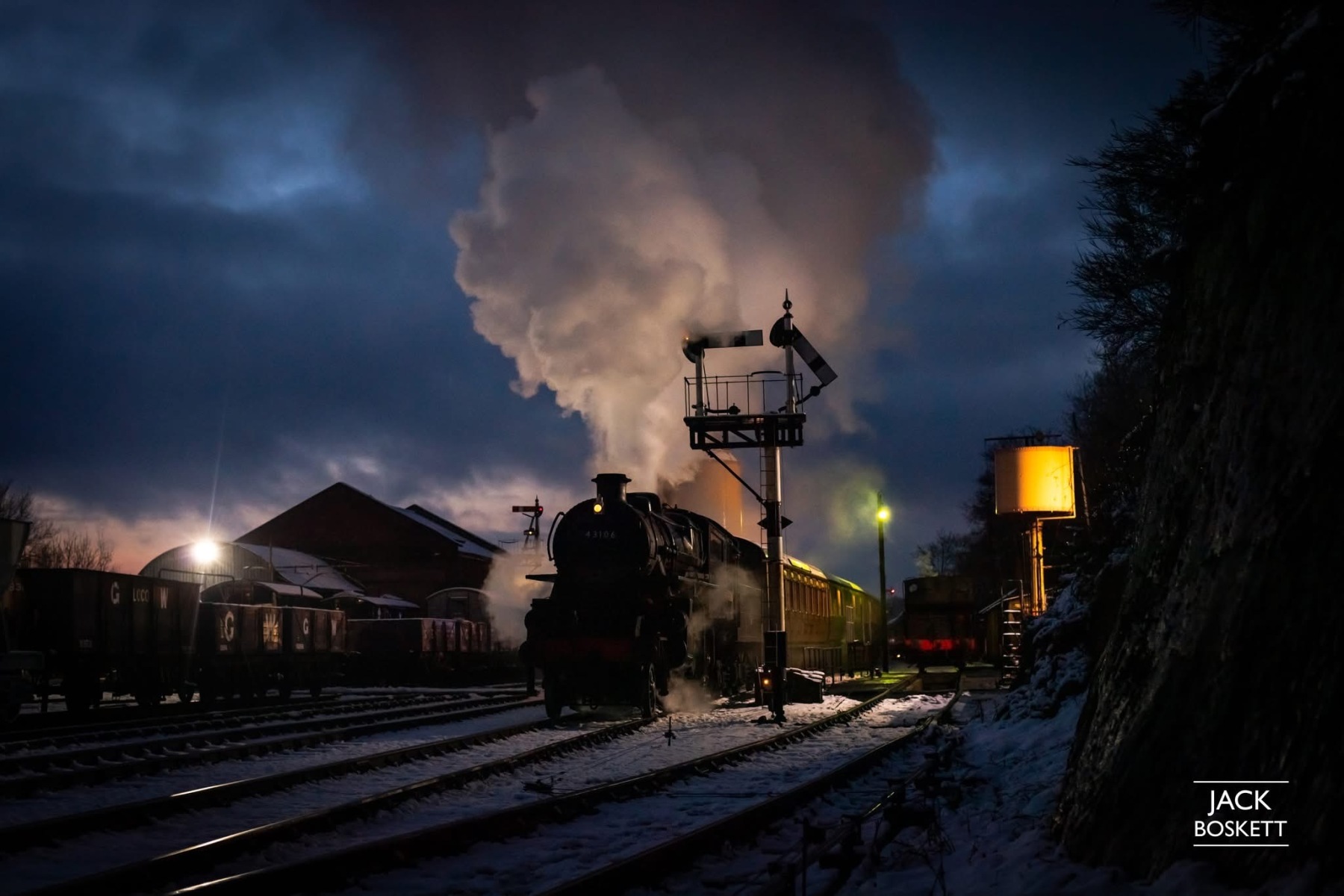 Hier zien we de LMS Ivatt Class 4 nr. 43106 “Flying Pig” in de sneeuw vertrekken van Bewdley Station aan de Severn Valley Railway.