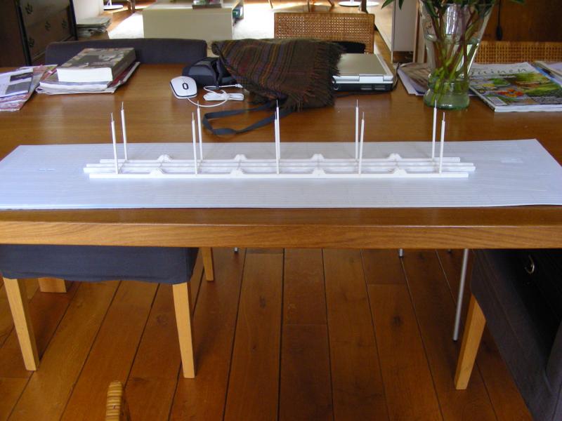 De getoonde 2 hoofdbovenliggers zullen nu met elkaar verbonden worden tot het bovendek van 1 buitendeel, overeenkomstig als voor het middendeel.