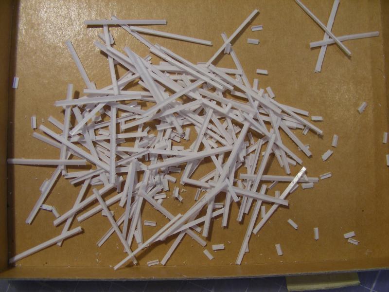 Eerst de bevestigingsstoeltjes, gefreesd uit 2mm styreenplaat met twee verschillende hoogtes vanwege de verschillen in hoogteligging van de onderconstructie, op de juiste plaatsen geplakt.