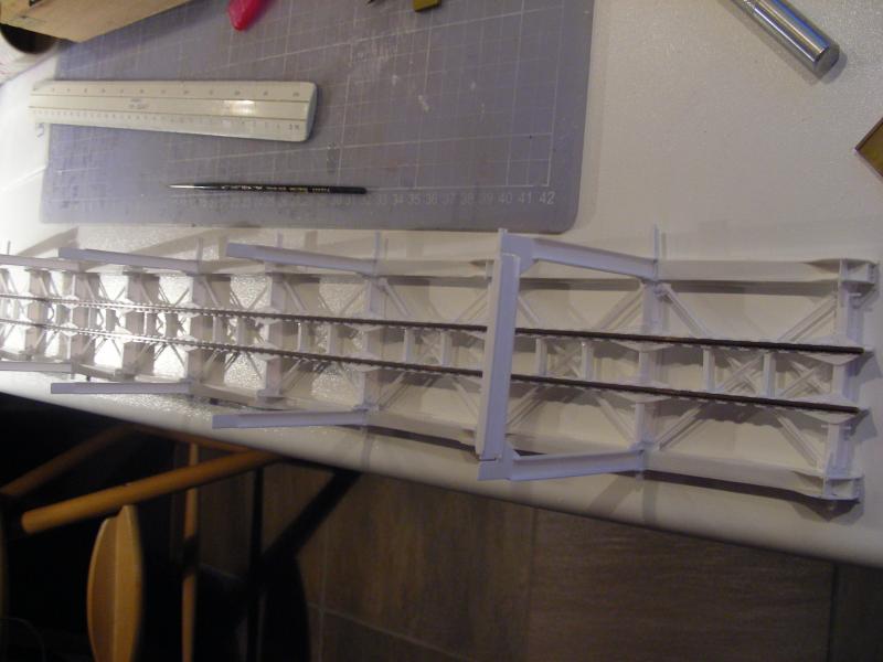 Vandaag een (voor mij) grote stap voorwaarts gezet. Allereerst de diagonalen van het onderwindverband aangebracht. Hierbij de hulp ingeroepen van een liniaal en een tweetal elastiekjes om te proberen de brug zo recht als mogelijk te maken. Dat ziet er dan zo uit: