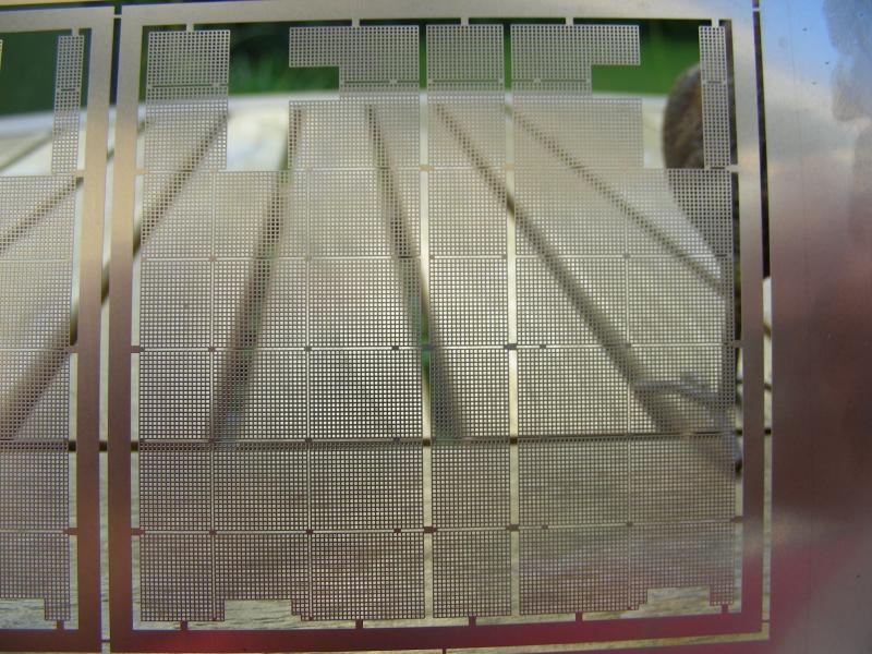 Zo, besloten de roosterplaten te laten etsen. Om er zeker van te zijn dat het straks ook past, voor de zekerheid maar een paar proefplaatjes uit styreen gefreesd. Ziet er veelbelovend uit.