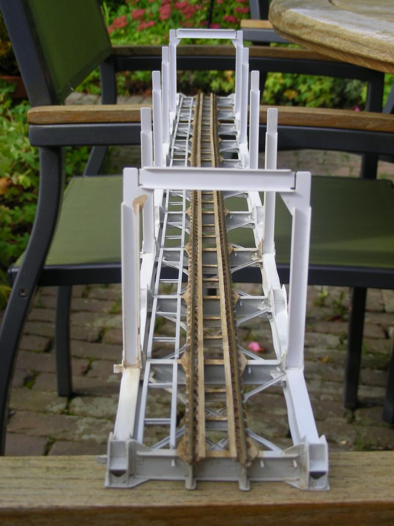 Ben al begonnen met het monteren van de diagonalen. De brug wint daardoor (gelukkig) behoorlijk aan stevigheid. Plaatjes volgen morgen.