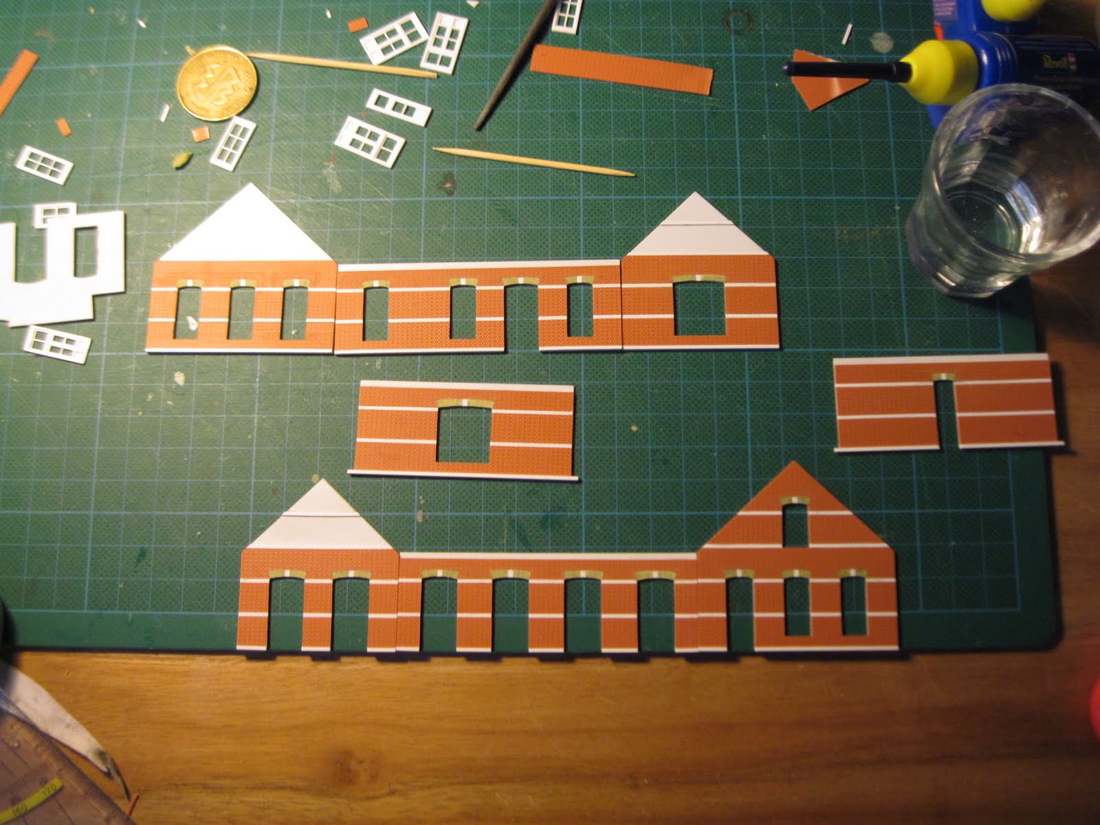 Na het in elkaar zetten en verstevigen van de muren was het een enorm gepriegel om de daklijsten en regengoten passend te krijgen. Wederom een kwestie van enorm veel styreen stipjes. Uiteindelijk bleek alles gelukkig goed te passen: