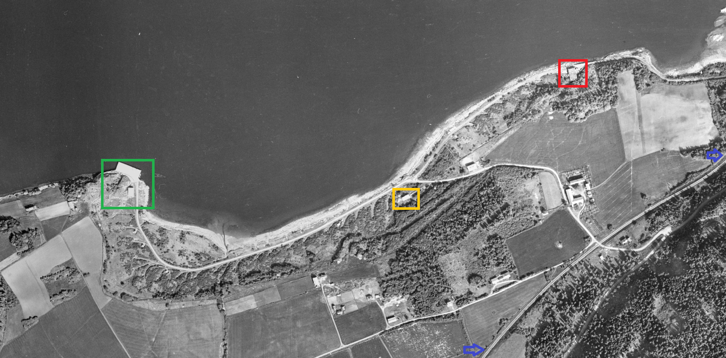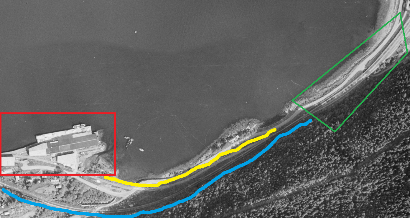 Het smalspoor volgt de kustlijn en bij het rode kader passeert het een bunker en betreed de feitelijke munitie opslag. Alle opslag bunkers liggen als een waaier naar links. Bij geel staat de lokloods. bij groen was een kade met verlading naar schepen. Tussen de twee blauwe pijlen loopt de Nordlandsbanen.