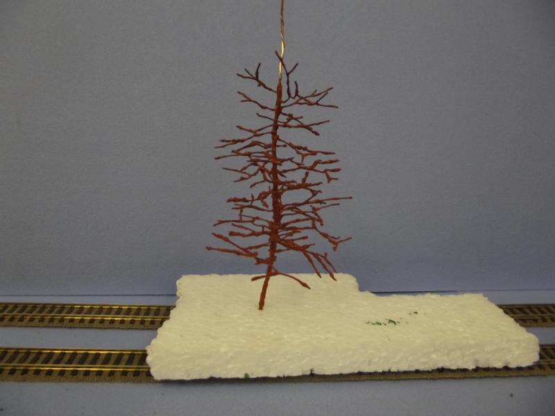 Aan de bovenkant steekt nog een stuk draad uit, deze wordt nog afgeknipt (tijdens het verfen van de stam kan ik dit nog vasthouden)