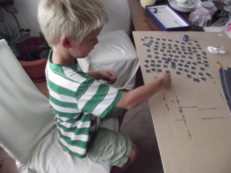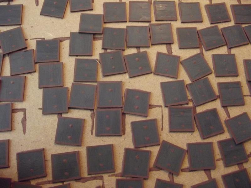 De stelcon-platen hebben we gemaakt van een plaat 1 mm styreen, deze hebben we gesneden in stukjes van 2 x 2 cm. Vervolgens is dit (donker) grijs geverfd, toen dit droog was hebben we de randen van (roest) verf voorzien.