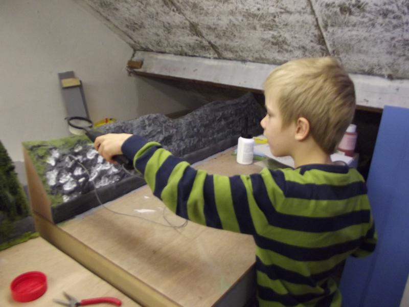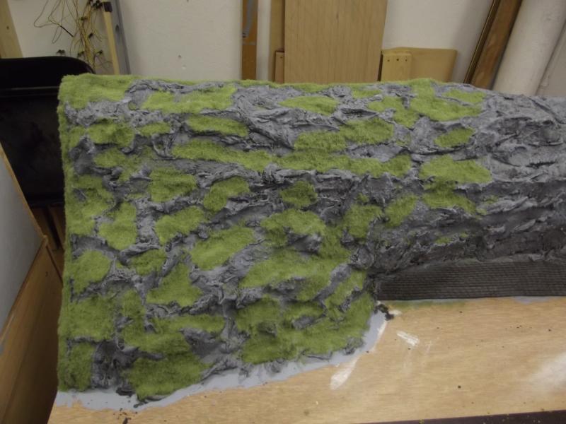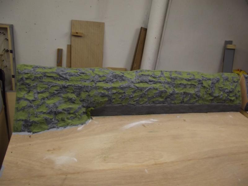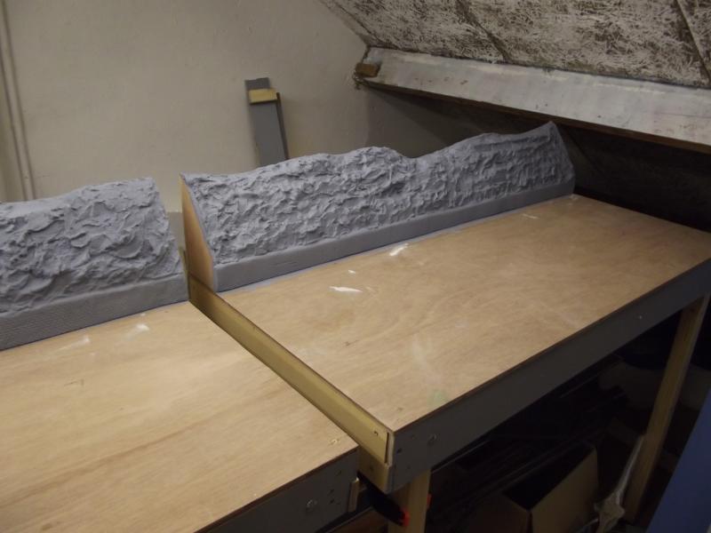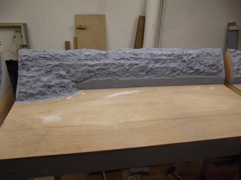 Binnenkort gaan we hier met sterk verdunde zwarte verf overheen, om meer diepte in de rotsen te krijgen.