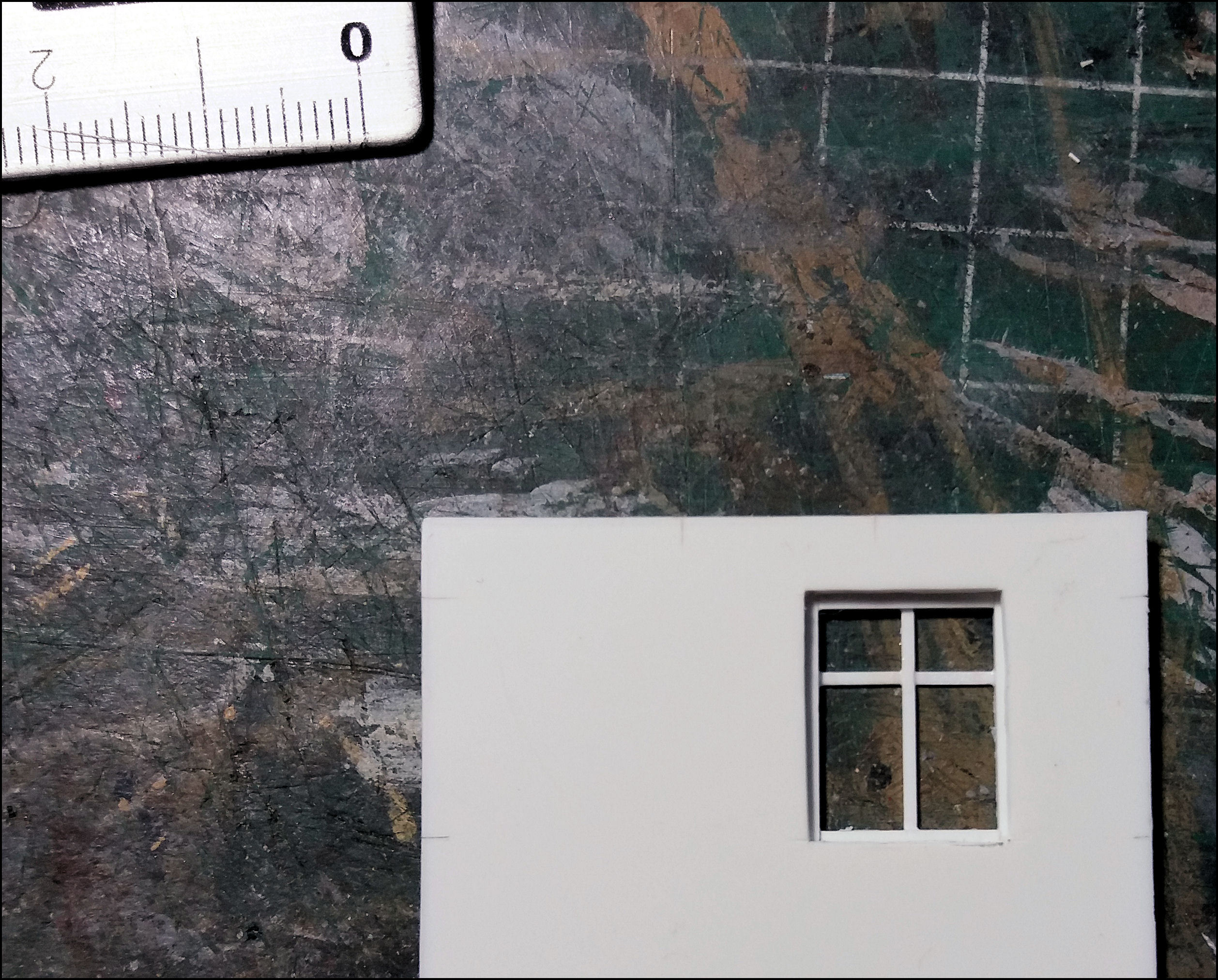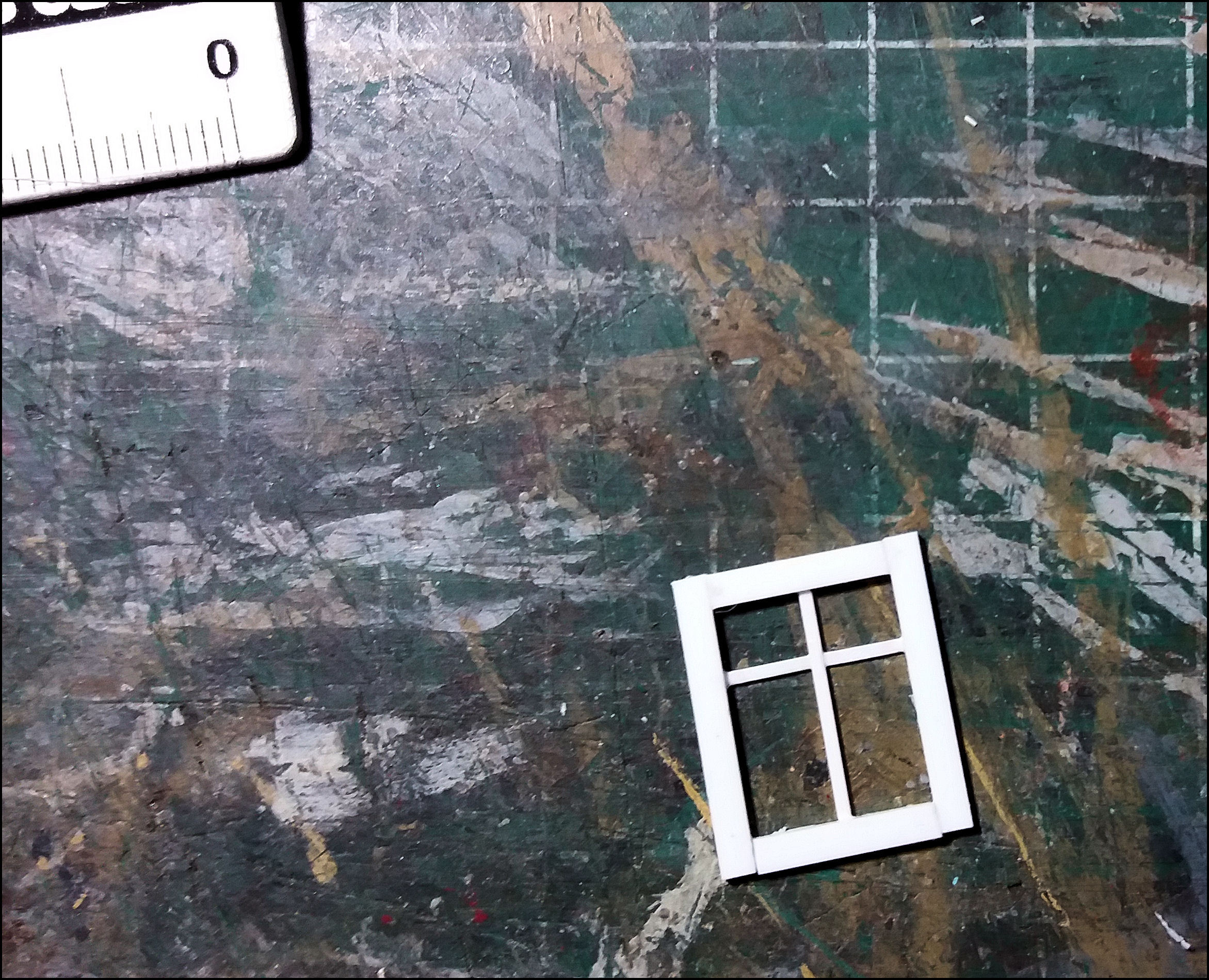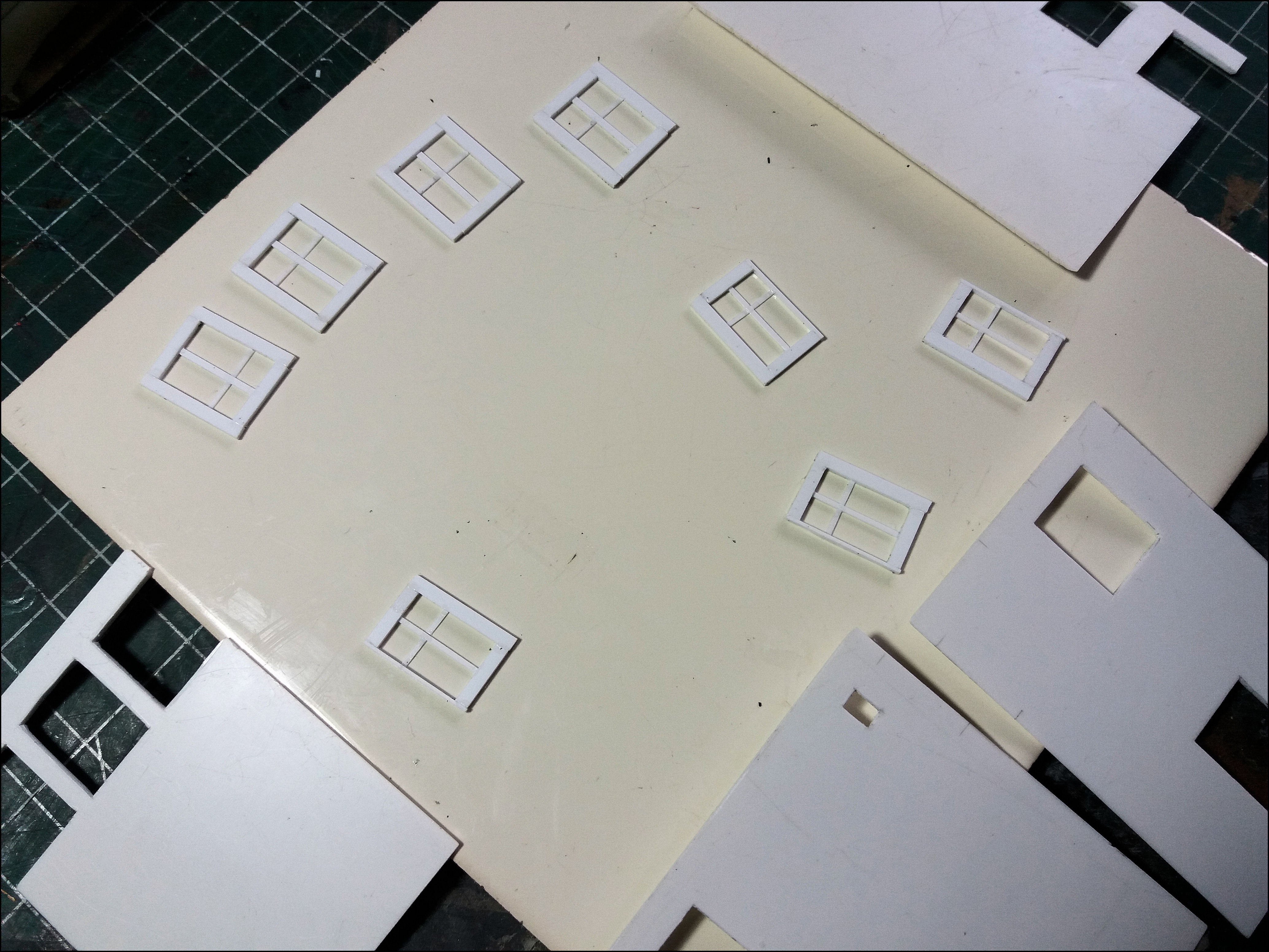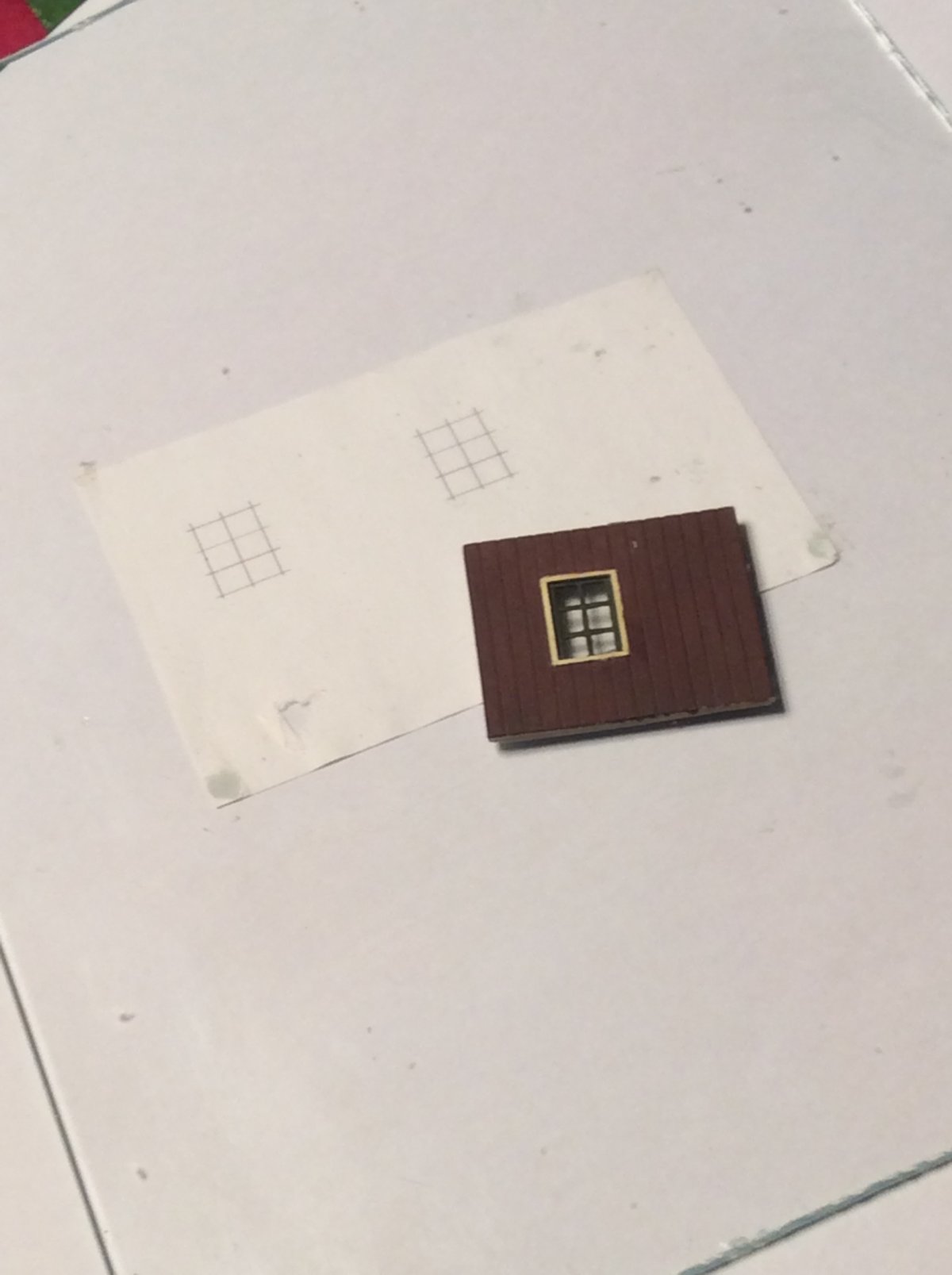 Het tegeltje wordt voor meerdere doeleinden gebruikt, bijvoorbeeld om er smalle reepjes of rare hoekjes maskeertape op te snijden of wanneer een absoluut vlakke ondergrond nodig is, zoals voor de raampjes in dit geval. De vloeibare plasticlijm hecht er niet (echt) op waardoor zo'n raampje, als de lijm eenmaal droog is, er gemakkelijk weer afgehaald kan worden.