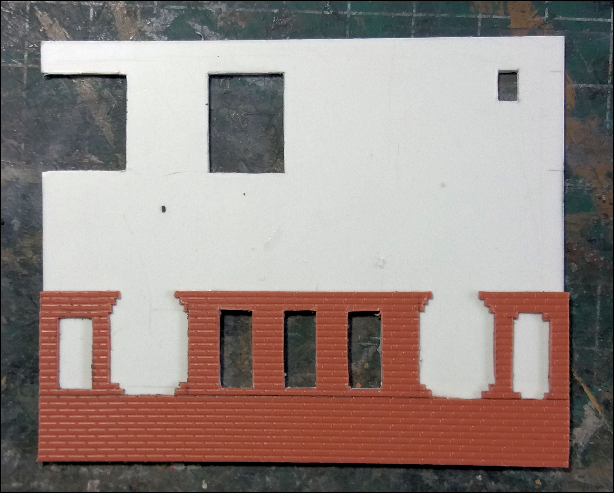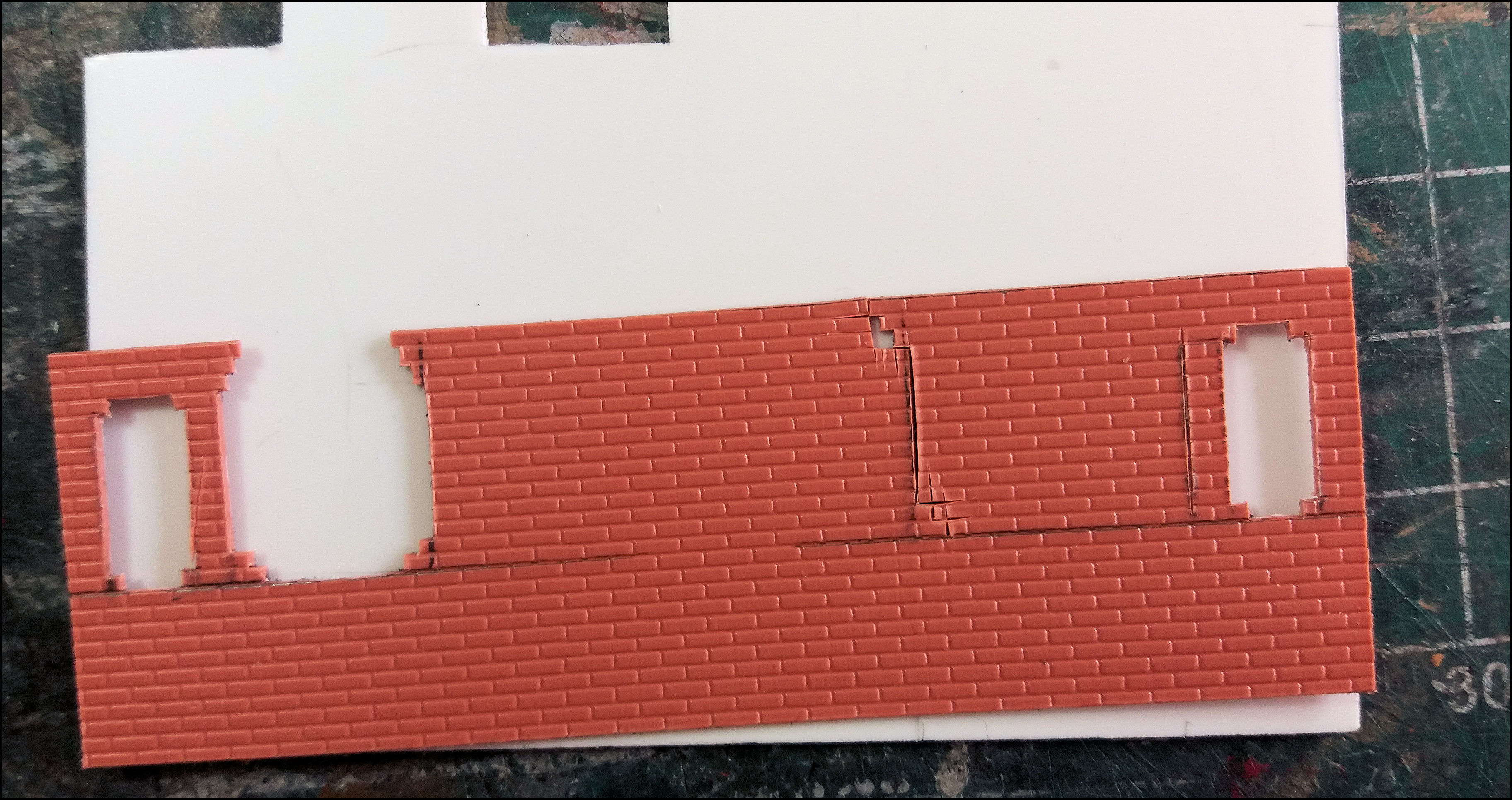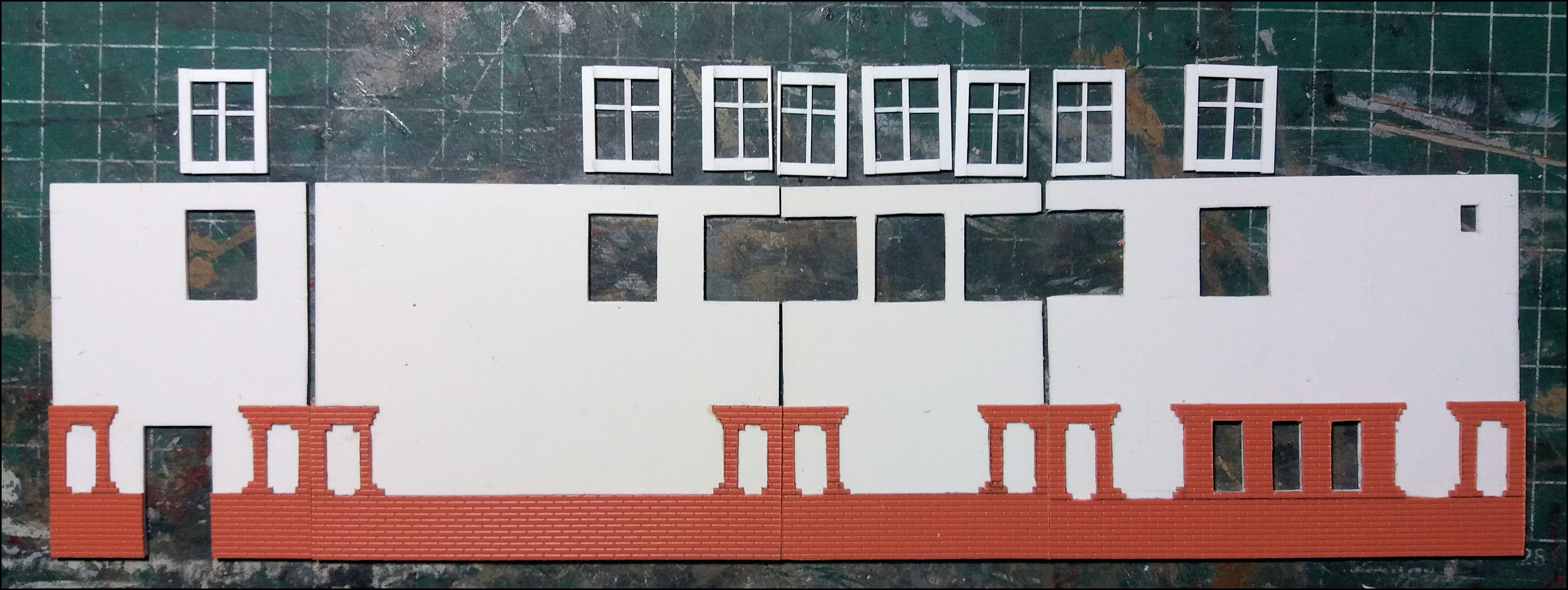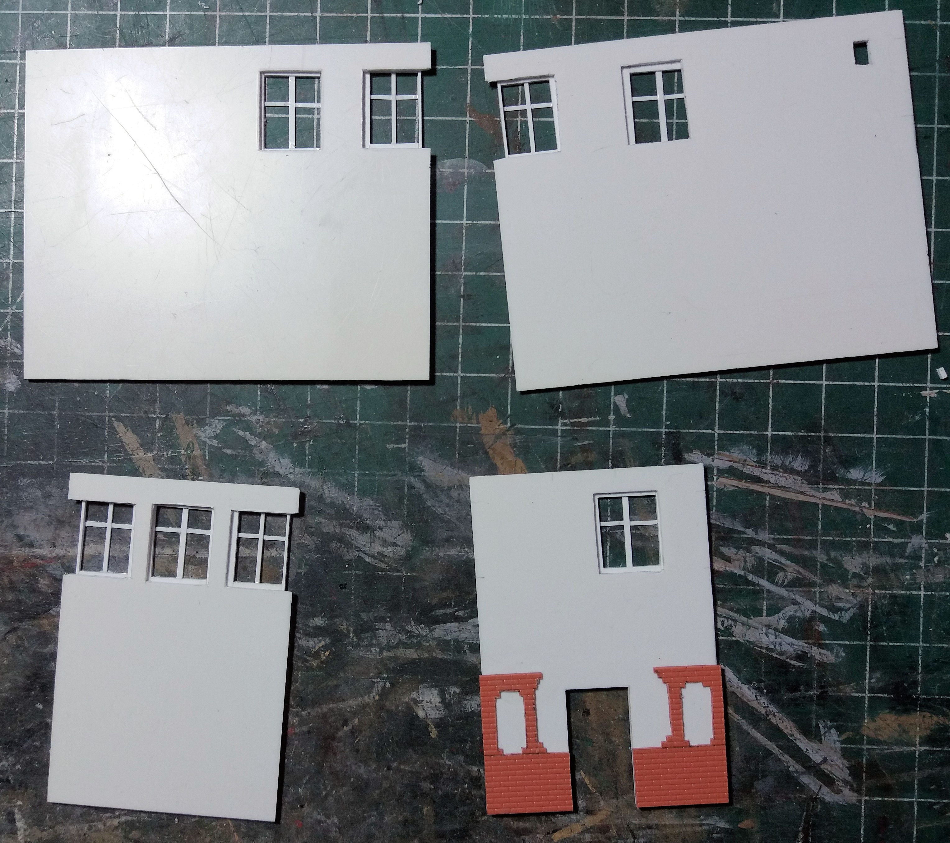 Het tegeltje wordt voor meerdere doeleinden gebruikt, bijvoorbeeld om er smalle reepjes of rare hoekjes maskeertape op te snijden of wanneer een absoluut vlakke ondergrond nodig is, zoals voor de raampjes in dit geval. De vloeibare plasticlijm hecht er niet (echt) op waardoor zo'n raampje, als de lijm eenmaal droog is, er gemakkelijk weer afgehaald kan worden.