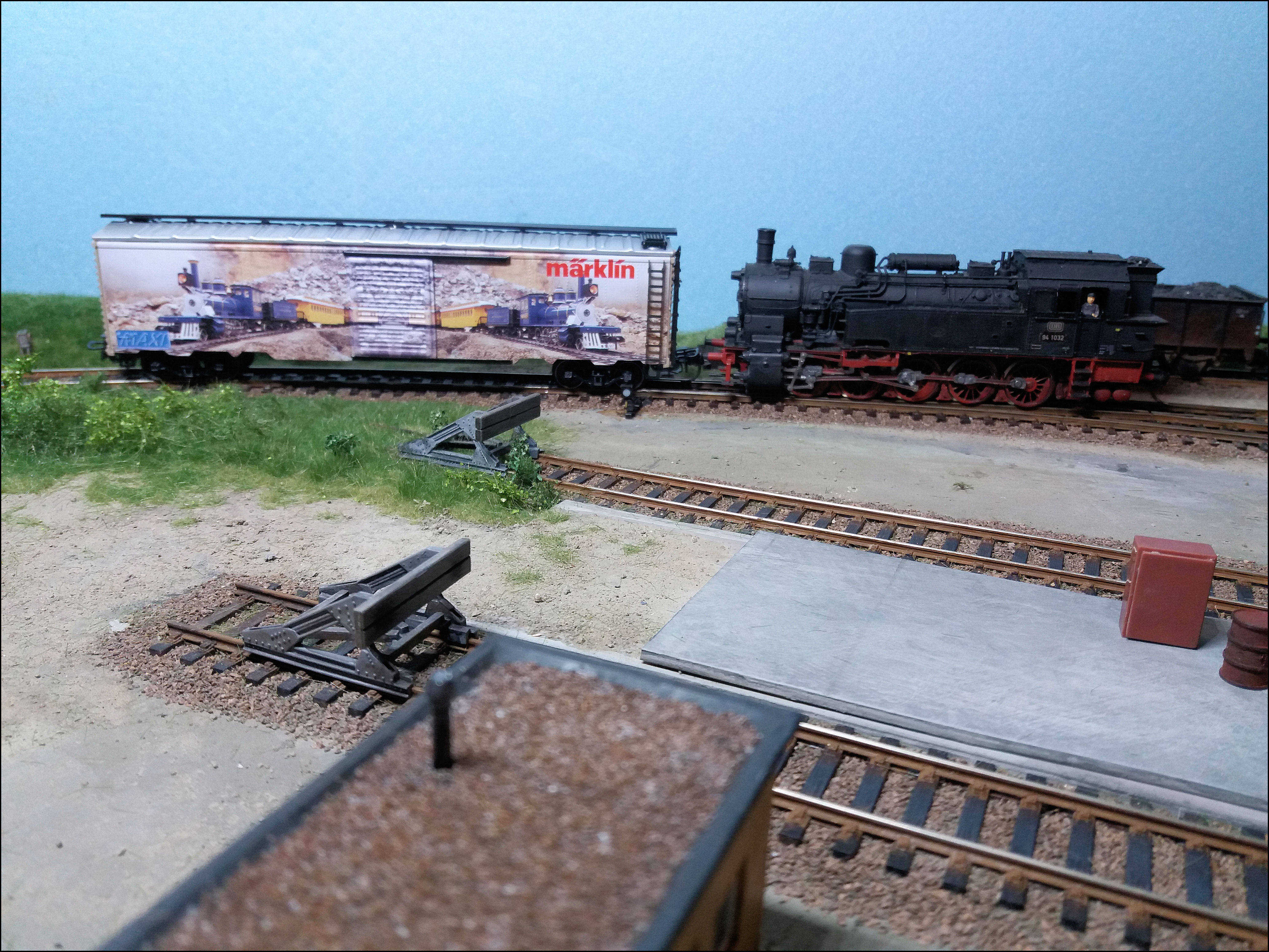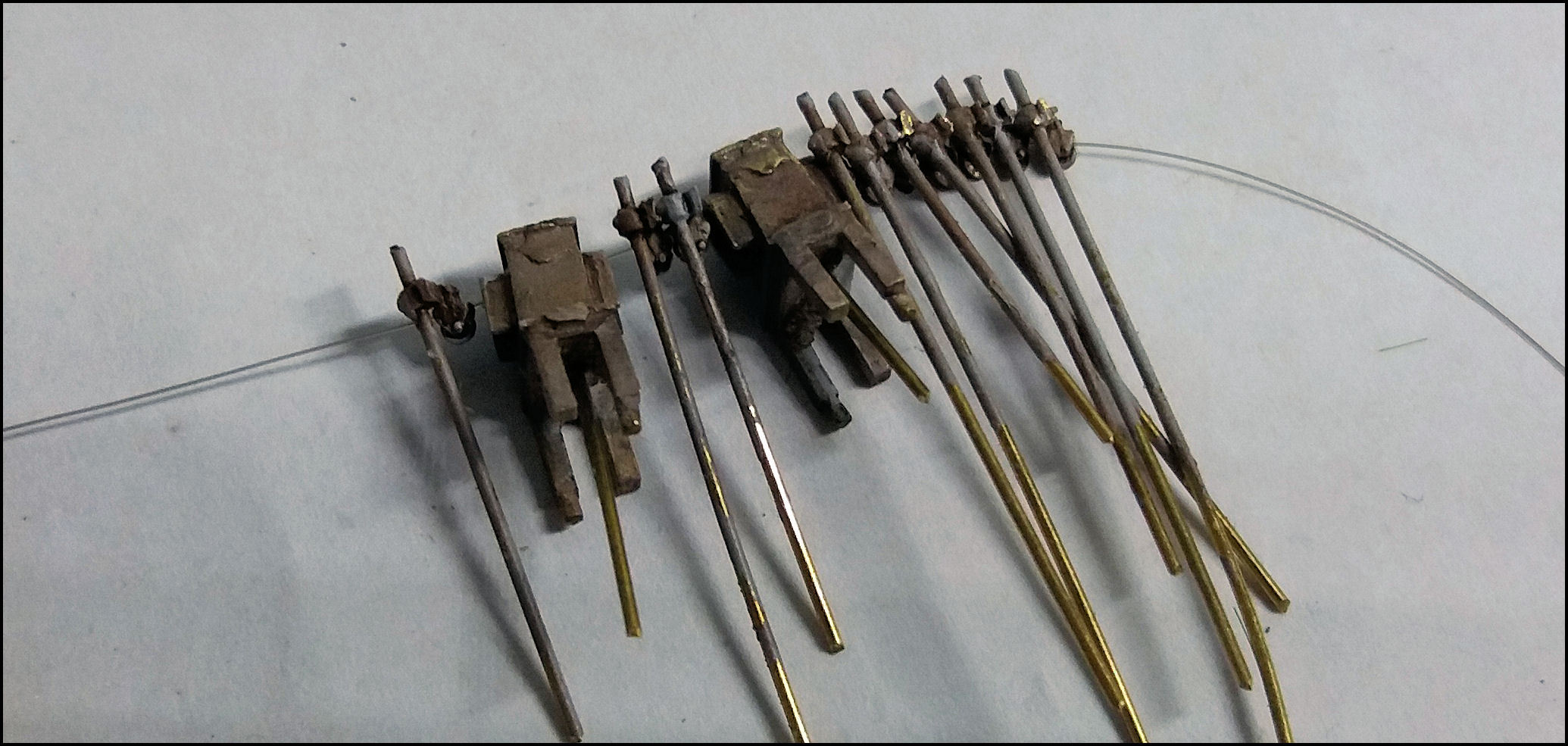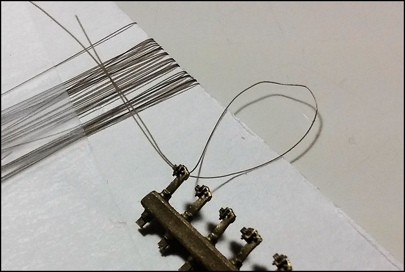 Welnu, dat heeft iets meer voeten in de aarde dan gedacht. Het bleek namelijk practisch ondoenlijk om de draad door de al naast het spoor geplante Rollenhalter te rijgen. Althans, voor mij wel. In de eerste plaats komt dat omdat die paaltjes min of meer aan de achterzijde van de baan zijn geplaatst, zodat ik tenminste een halve meter over de baan heen moet gaan hangen om er met dat vrijwel onzichtbare draadje bij in de buurt te komen, en dan ook nog door een gaatje kleiner dan een halve millimeter zien te wurmen. Na ongeveer drie kwartier emmeren hield ik het wel voor gezien. Je moet je grenzen tenslotte wel (h)erkennen als je er eentje tegenkomt.