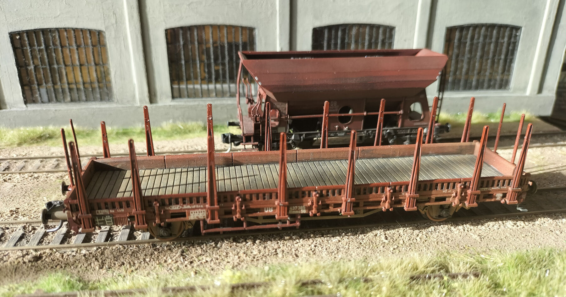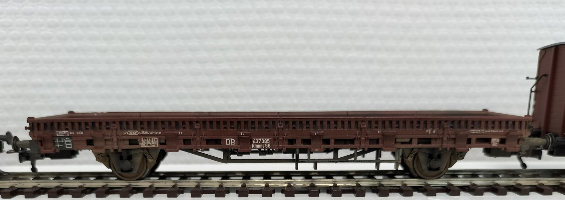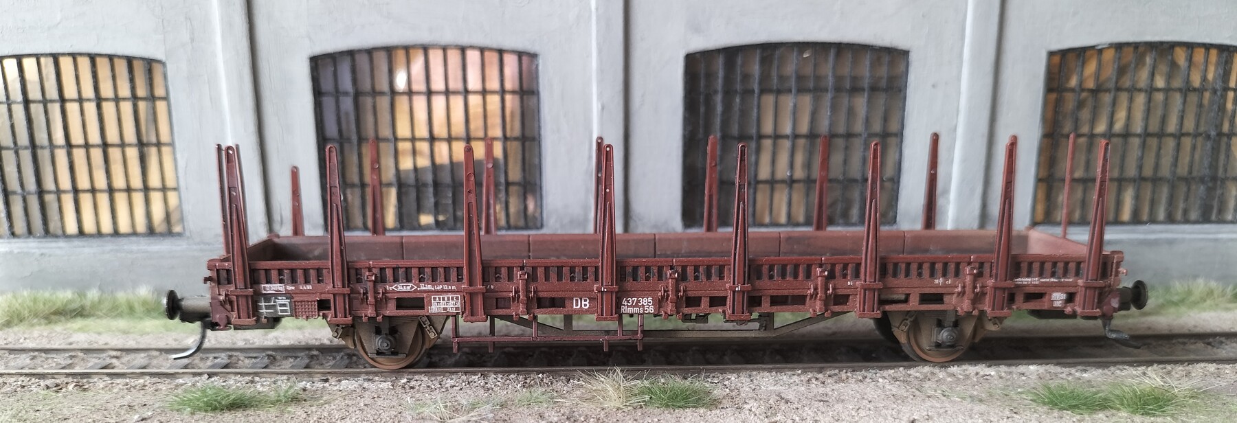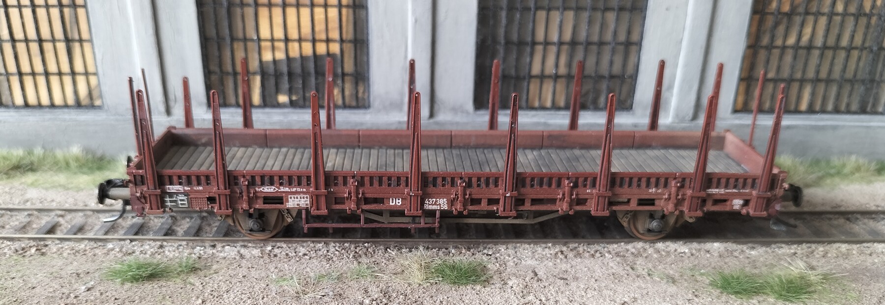 Nog een paar details (wat "vet" op de buffers en zo) en dan ben ik met deze wagen (we hebben het over de Rlmms56  437 385) dik tevreden. Een lading laat ik, voor de afwisseling, denk ik, deze keer maar achterwege. Een lege wagon kwam ook nog wel eens voor.