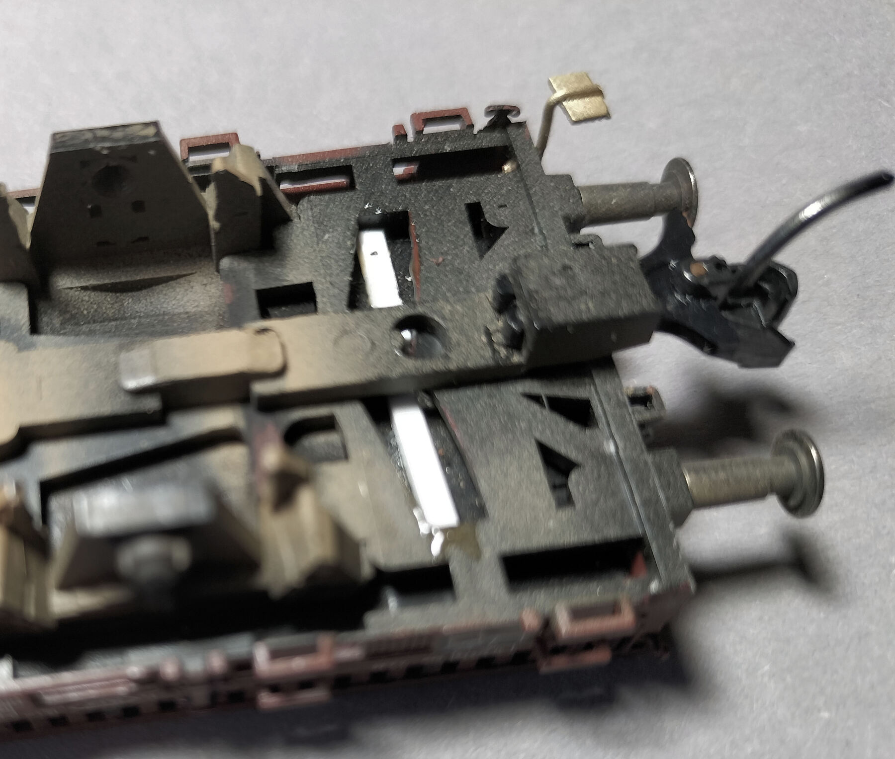 Verder denk ik dat Roco die "consoles", "nokken" dan wel "bufferverlengingen" standaard heeft aangebracht, die zitten op alle DB-wagens (maar niet op die van de NS). Wel opvallend: ofschoon op alle DB-wagens de "nokken" aanwezig zijn, geldt dat niet voor de gaatjes (waarin het bordes met z'n "nokjes" moet worden gestoken.