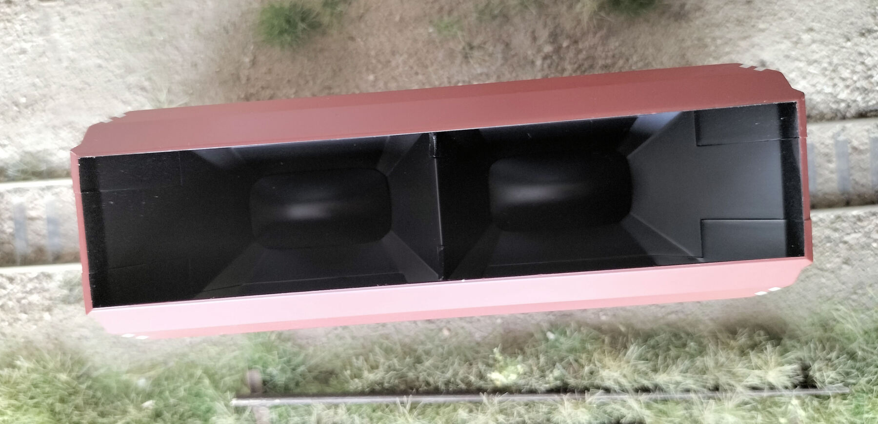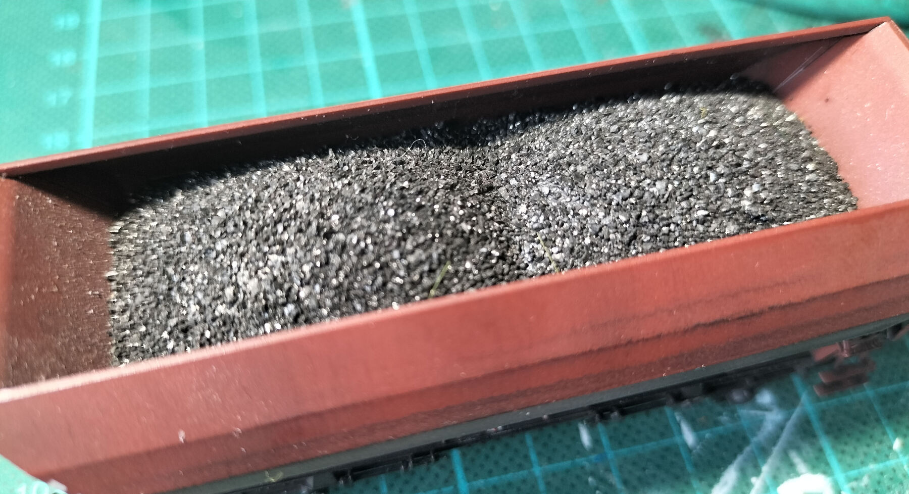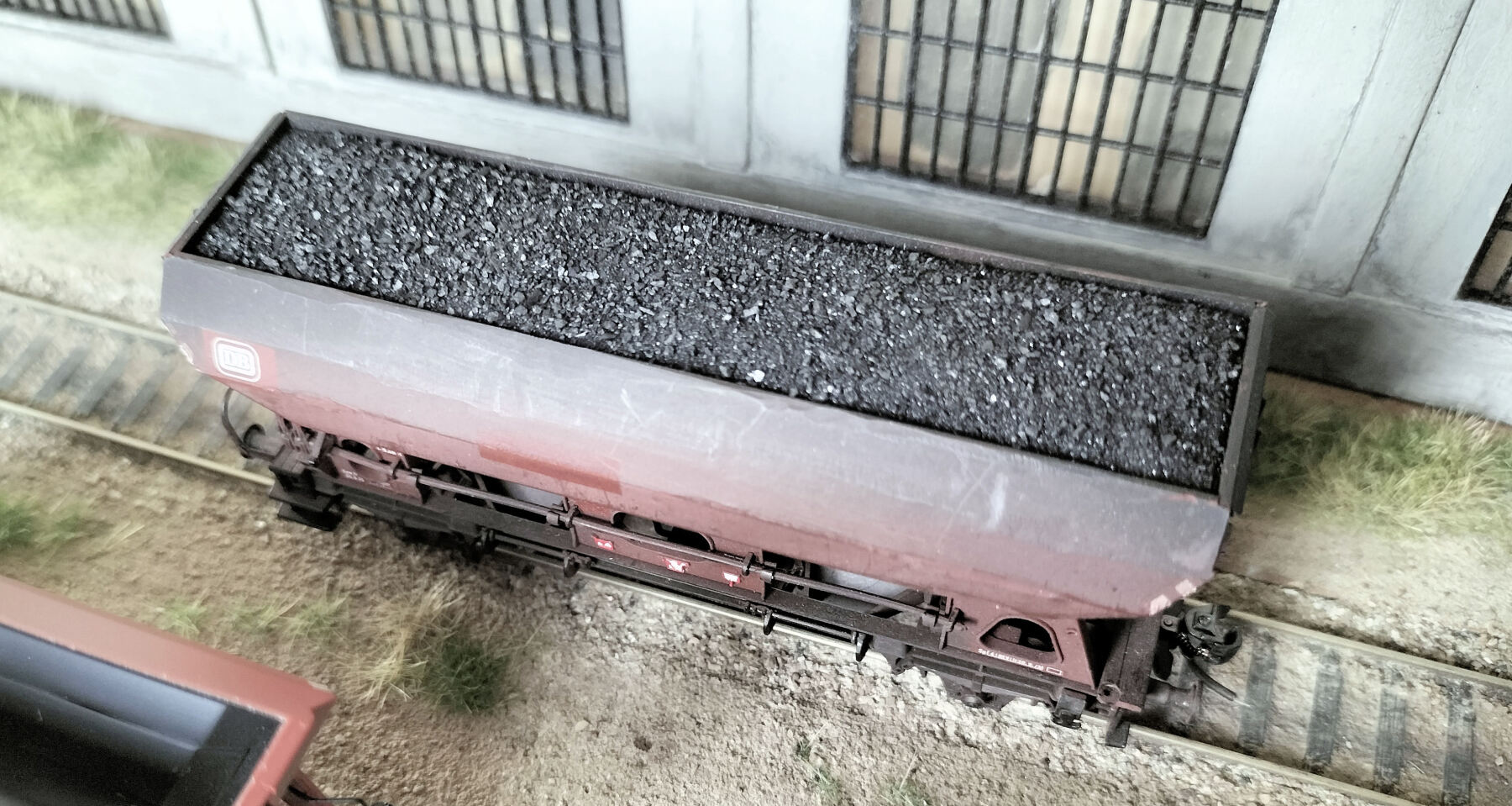 Er is toen ook een lading steenkool ingebouwd, waar ik een poos later niet tevreden mee was en een nieuwe lading heb gemaakt. Helaas ook niet uitneembaar, want het binnenwerk van de wagen is niet toonbaar omdat er allerlei dwarsverbindingen en zo te zien zijn, waardoor een natuurgetrouwe nabootsing van een lege wagen onmogelijk is geworden.