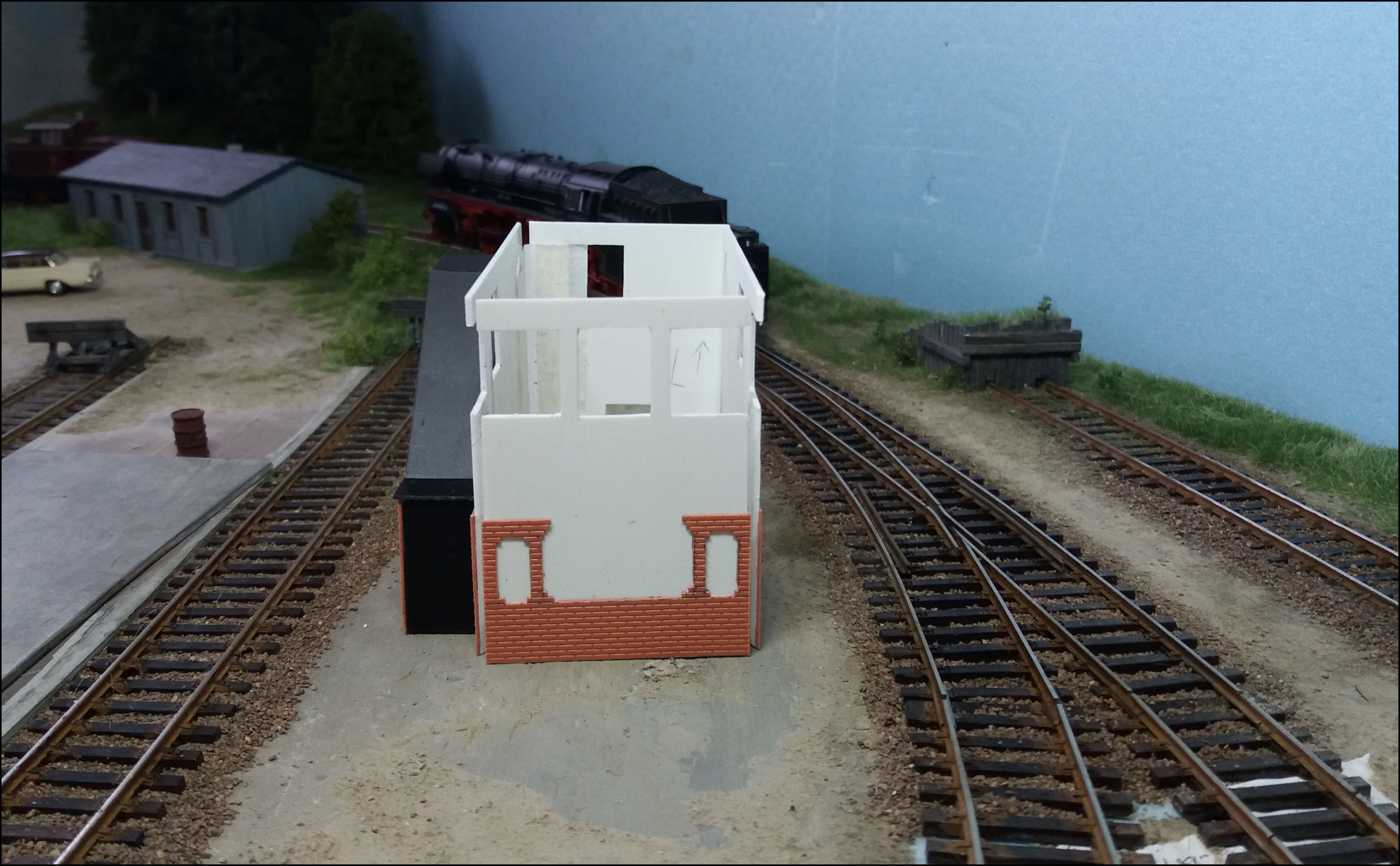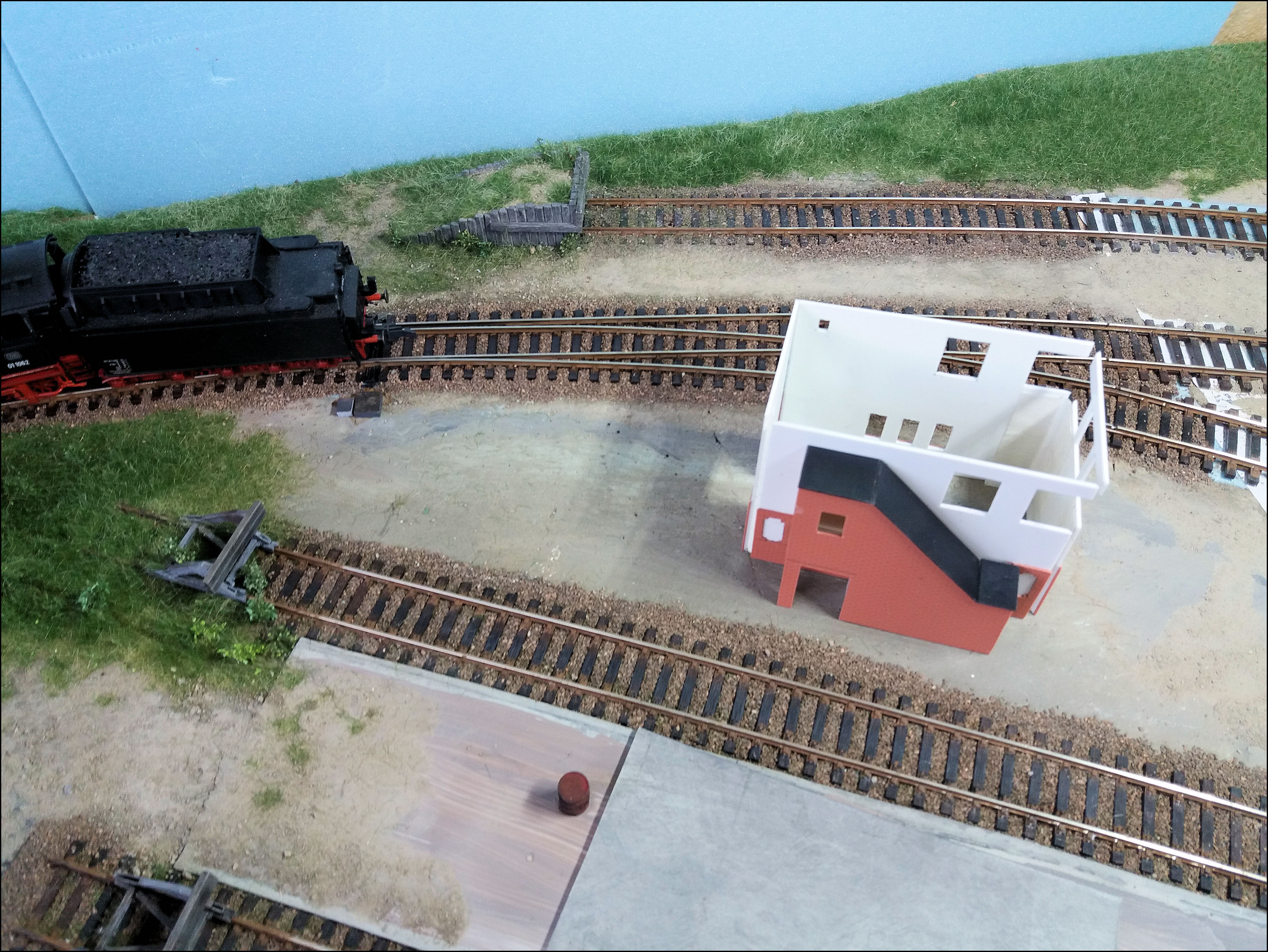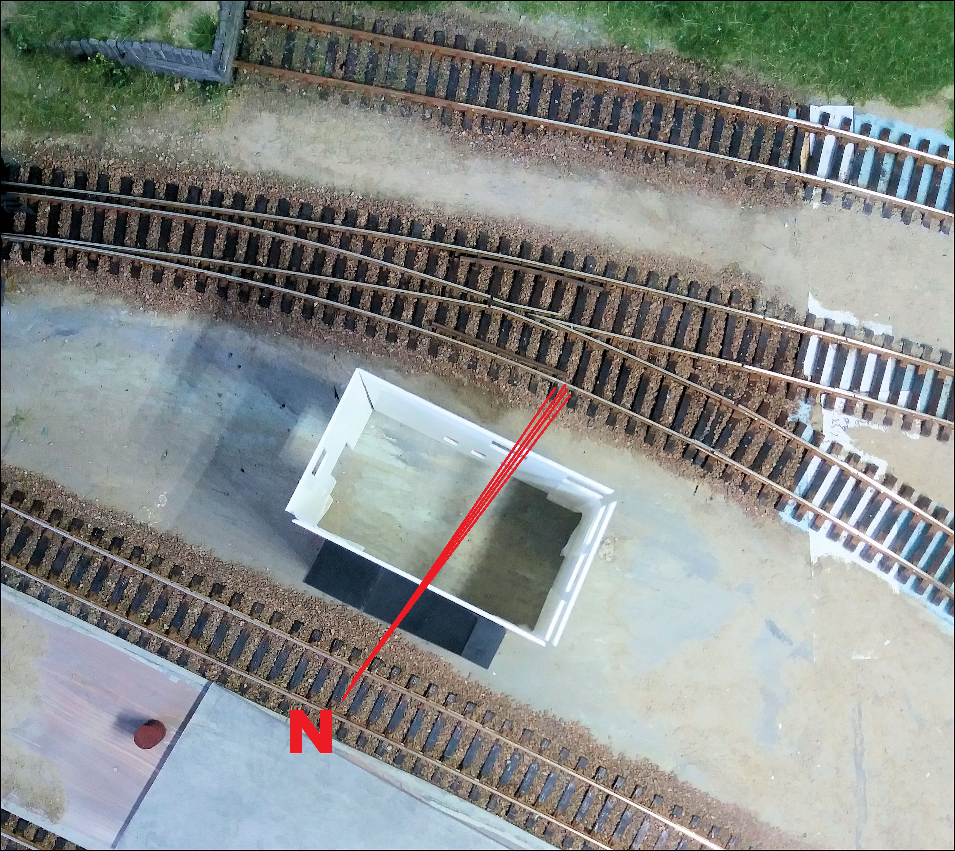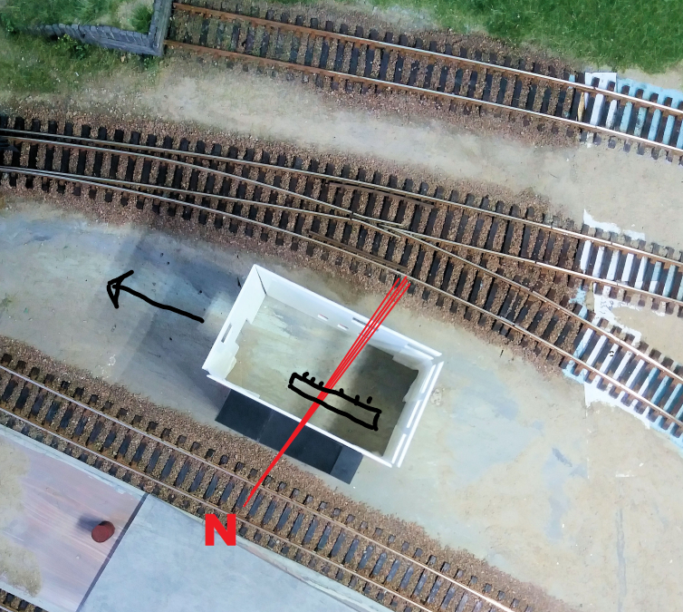 De oostelijke gevel, met het ene raam, was degene waar ik me wat zorgen over maakte. Zie de zwarte pijl hieronder. Heb je daar voldoende zicht op de locomotieven die via het wissel omrijden? Of op het emplacement afkomen?