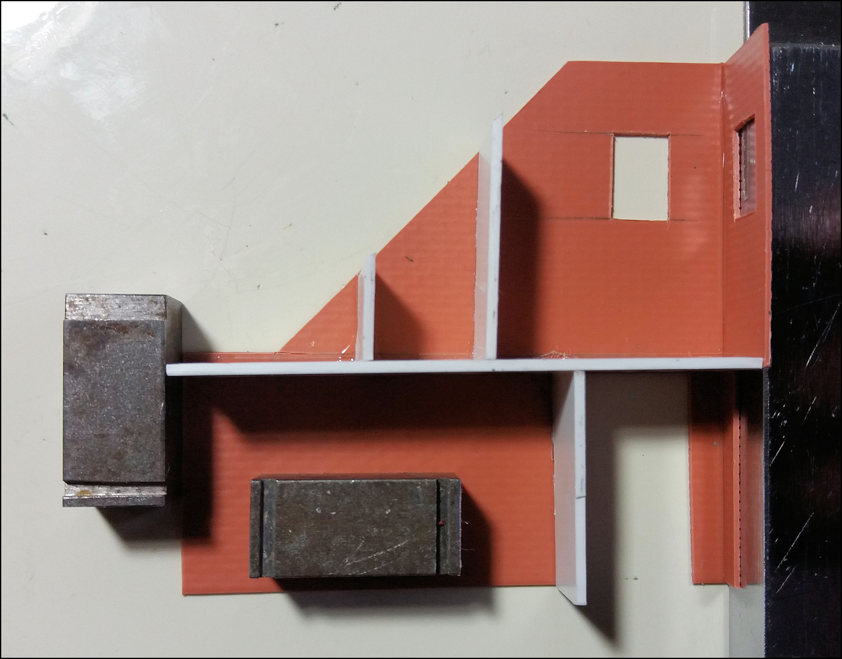 Er is ook nog een raam in de 'achtergevel', dat uitzicht biedt op het wissel. Ik stel me zo voor dat dat ook geopend kan worden (voor bijv. communicatie met binnenkomend verkeer). Over de inrichting van die bovenverdieping heb ik nog niet echt nagedacht, wat natuurlijk dom is, want daarvan hangt ook de indeling van de vensters af, en ook de positie van de opgang. Nu wordt het andersom-werken: de inrichting hangt af van de vensterindeling en overige elementen (trap, toilet). De Hebelbank zal denk ik in de westelijke helft een plekje moeten krijgen.