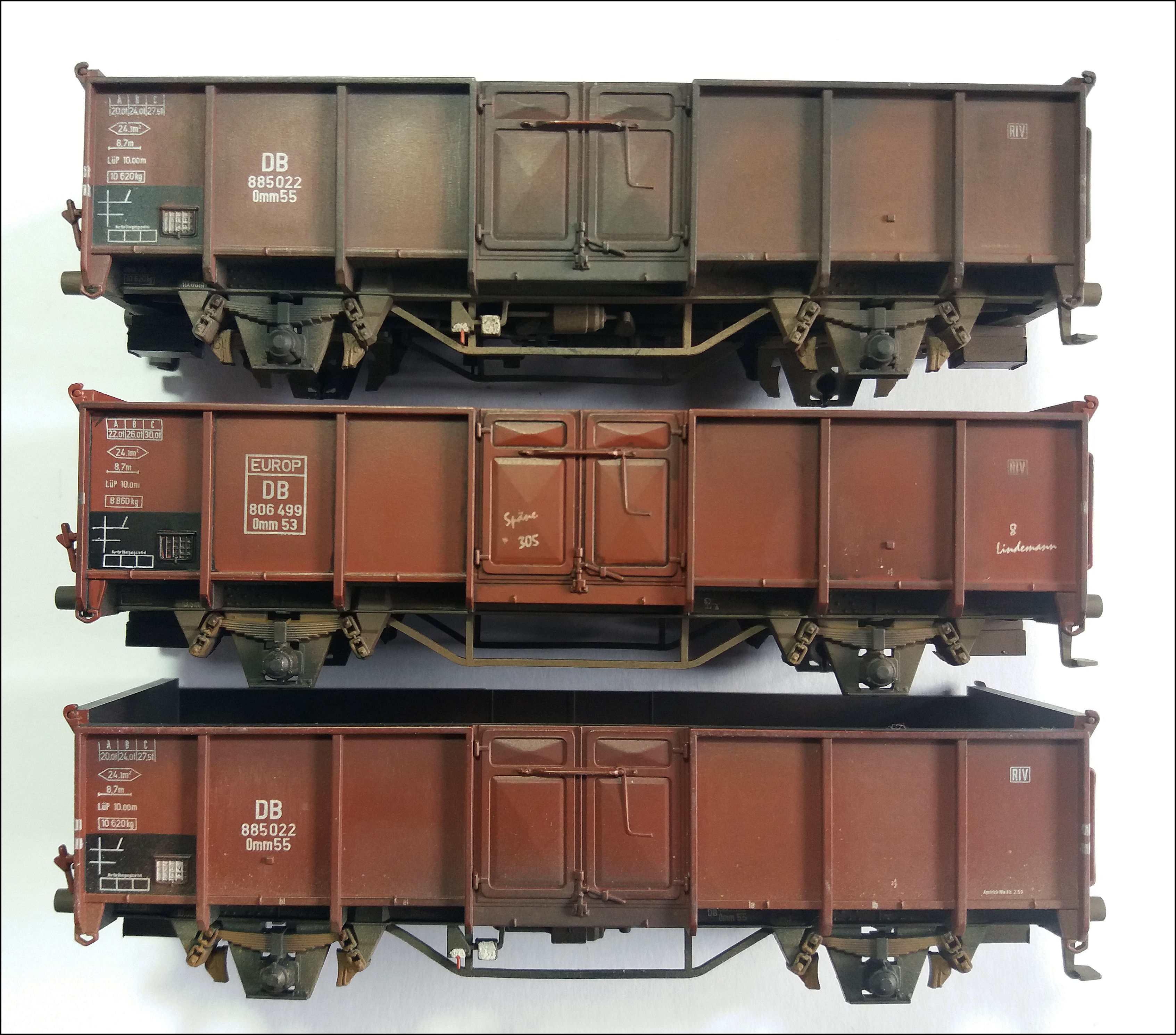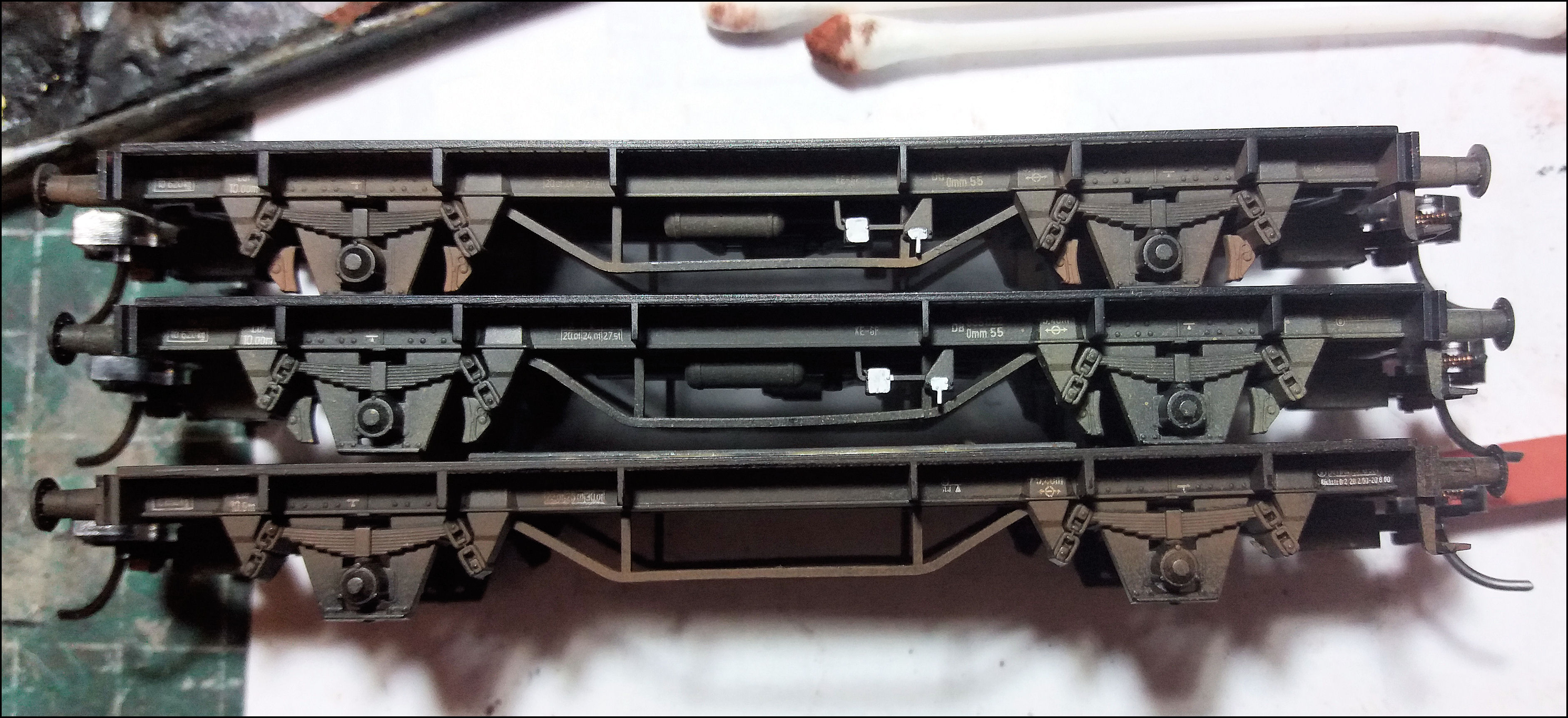 De drie onderstellen met nog niks gebeurd, behalve wat sporen van een (veel) eerdere airbrushbehandeling en de wit aangestipte remdingessen: