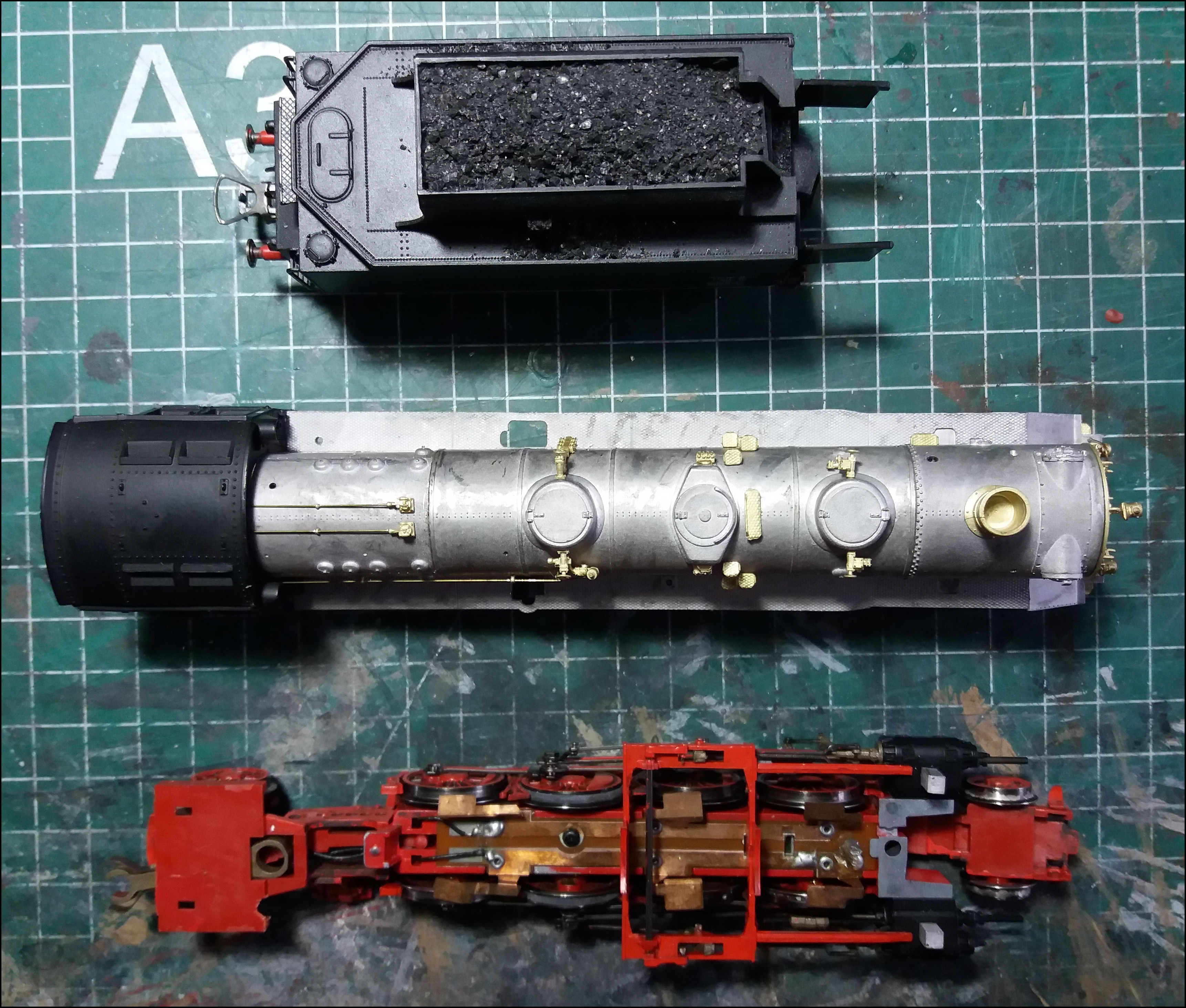 Na al die tijd boven op de kast te hebben gebivakkeerd, is het wel even een kwestie van goed "inlezen" teneinde de draad weer te kunnen oppakken. Bovendien zijn er een paar eerder bevestigde onderdelen losgeraakt. Die zullen weer opnieuw moeten worden aangebracht. Dat ze zijn losgeraakt is, zo vermoed ik althans, veroorzaakt door het gegeven dat ik, toen ze op hun plek werden gelijmd, verzuimd heb de boel goed te ontvetten. Dat is dus wel even een leerpuntje.