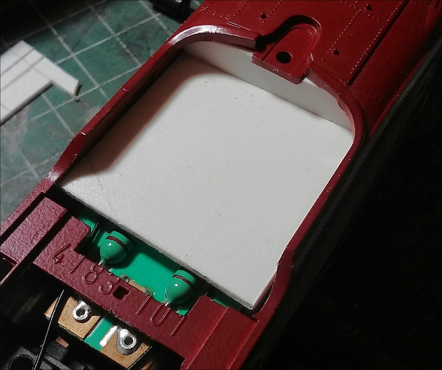 Eigenlijk zou hij dieper moeten, maar daar zit helaas de stekker van de decoder (en de printplaat) in de weg. Dat is niet anders, dus straks maar een flink gemankeerde machinist in het hok zetten.