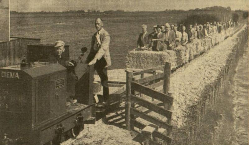 De trein heeft met een aantal genodigden zojuist de opslagplaats aan de voet van de dijk verlaten en rijdt nu over een talud de zomerpolder uit. Hierna daalt de lijn tot kwelderniveau. Links achter de trein zijn de bossen rijshout zichtbaar, die normaliter met het lijntje vervoerd worden.