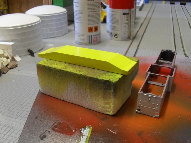 Inmiddels zitten alle gaten voor de buffers, luchtslangen en koppelhaken in het frame, en het is nu helemaal geel.