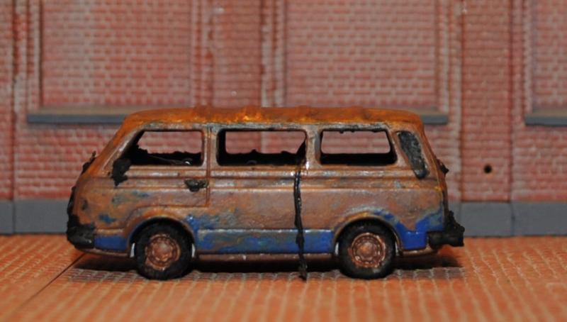Het is voor mij ook geen dagelijkse bezigheid om auto's in 1:87 er uitgebrand uit te laten zien. Maar misschien hebben de banden het overleefd omdat de warmte naar boven is geslagen.....kijk maar naar de strook blauwe verf die nog aan de onderkant van het busje te zien is.