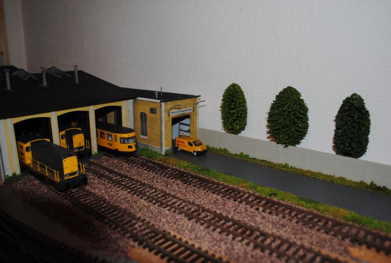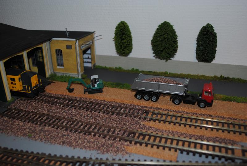 Vooral het magazijn maakt het geheel realistisch en sfeervol. En dan te bedenken dat dat gedeelte juist zelfbouw is....... En die bomen of betonplaten.......... dat kan altijd nog. In ieder geval zeer geslaagde opzet. En die treinen........... mooi spul natuurlijk. Hopelijk pendelen ze snel tussen Wael en Bosch en Den Zoedel.