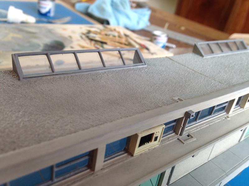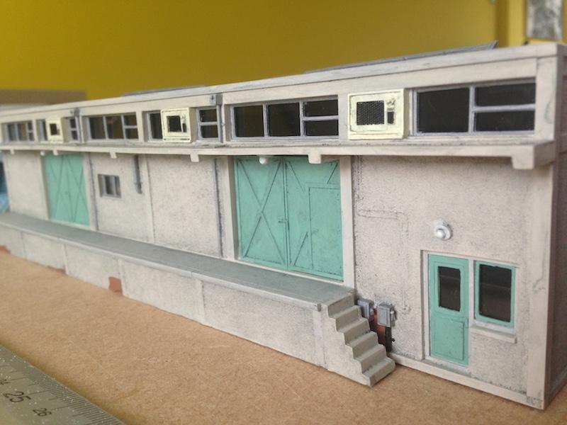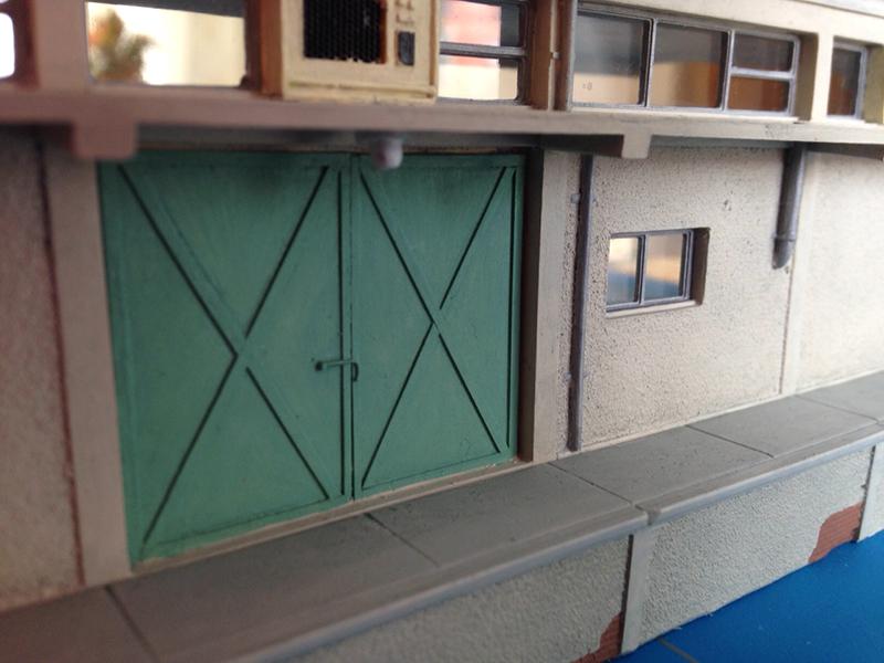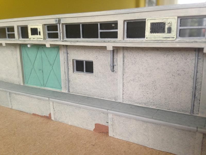 . Je ziet hier wat extra 'vlekken' aan de onderzijde van de muren, lang het raampje in het midden en bij het perron. Zal ik dan nog een andere kleur wash gebruiken dan wat ik nu doe (1:1 mix groen/zwart)?