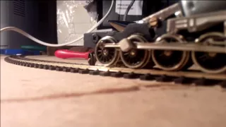 Ondertussen heb ik op mijn testplank de oude TT-rails die ik ooit had opgeduikeld vervangen voor Peco H0m rails. Ten eerste omdat ik moest erkennen dat het chassis nooit - echt helemaal nooit - een bocht met een radius van 23cm succesvol gaat doorlopen. Ik heb nu een wat flauwere bocht van flexrails gemaakt die ik voor testdoeleinden zo kan buigen dat ie scherper wordt. Heel nauwkeurig heb ik het nog niet bepaald maar mijn doelstelling dat de loc in ieder geval door een radius van 50cm kan lopen heb ik wel gehaald. Zo te zien gaat het tot zo'n 40cm nog vlekkeloos.