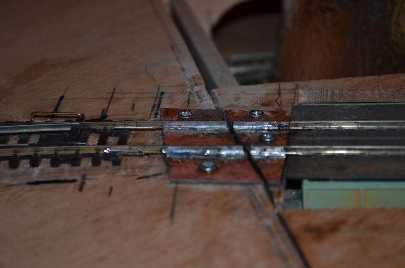 Bij latere overgangen heb ik eerst de rails gesoldeerd op de koperplaat, doorgezaagd en daarna met 2 schroefjes vast gezet.