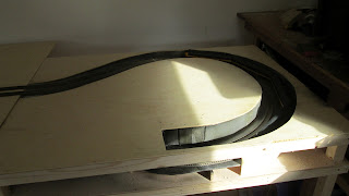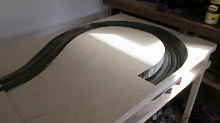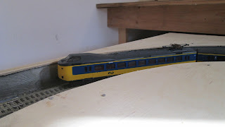 Wel veel gedaan. De rails in beide bogen ligt vast en aangesloten op de rest van de baan qua stroom. Beide bogen in elk segment krijgen hun eigen voeding. Neergaand wat minder power en omhoog lekker veel. Dat betekend dat de treinen ook niet zo hard het schaduwstation in denderen...  (y)