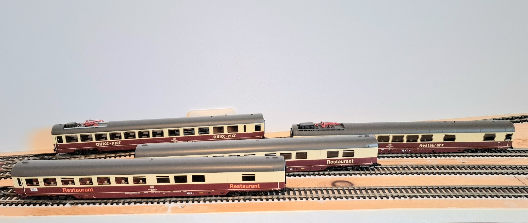 Weliswaar een matige foto in kunstlicht, drie crème/rode DB restauratierijtuigen: