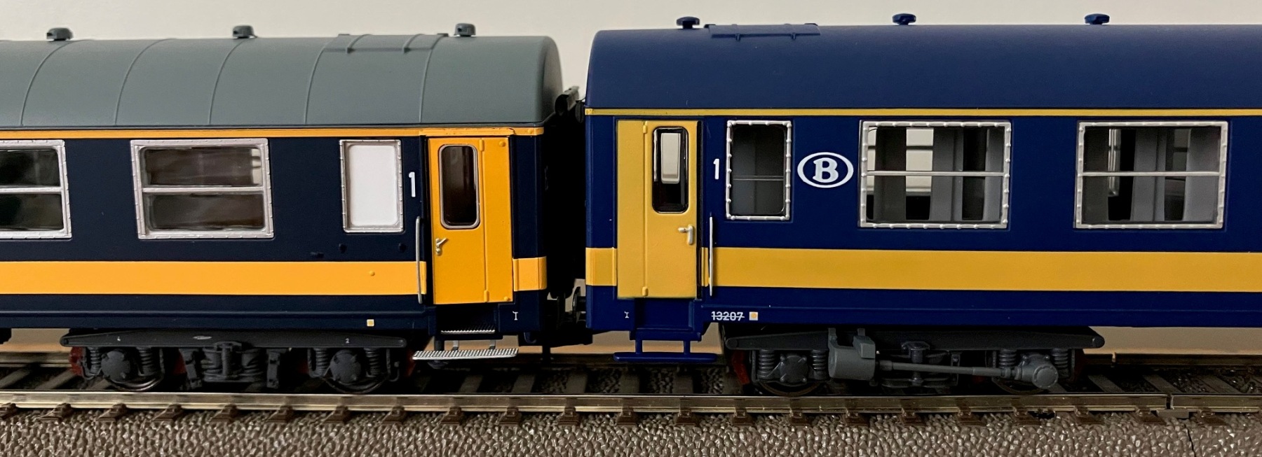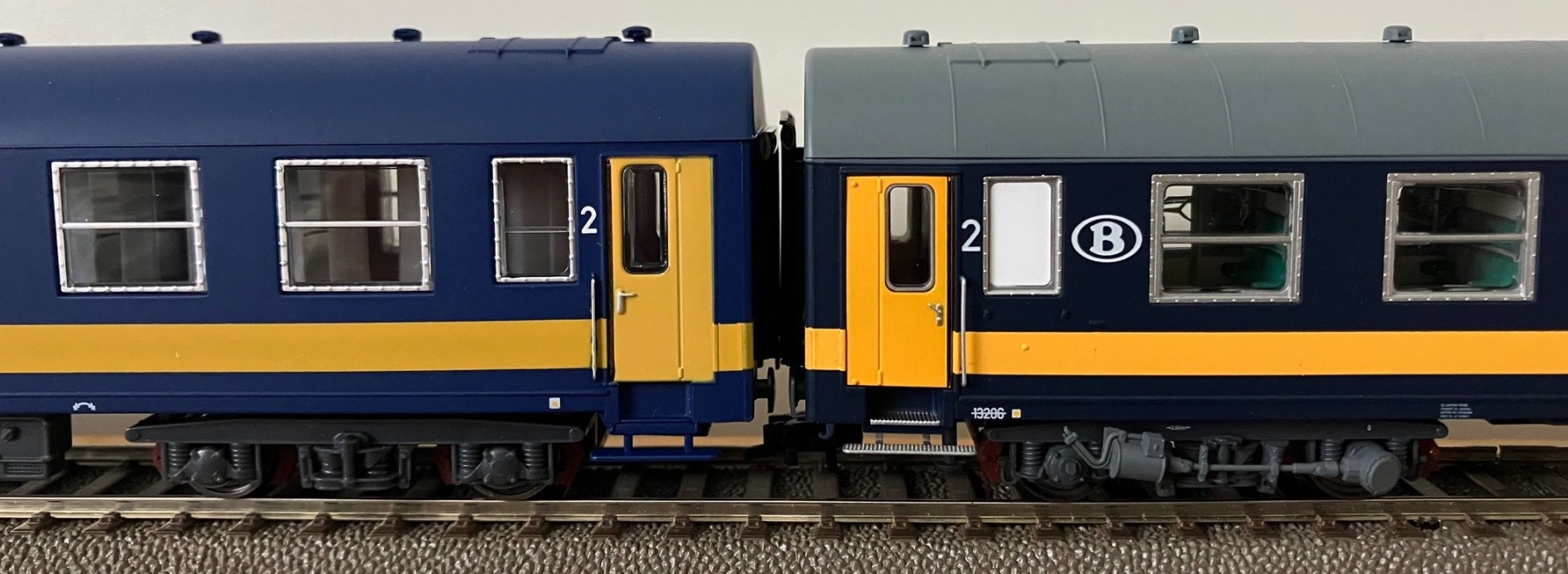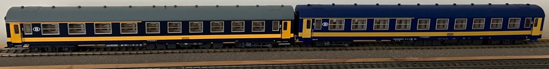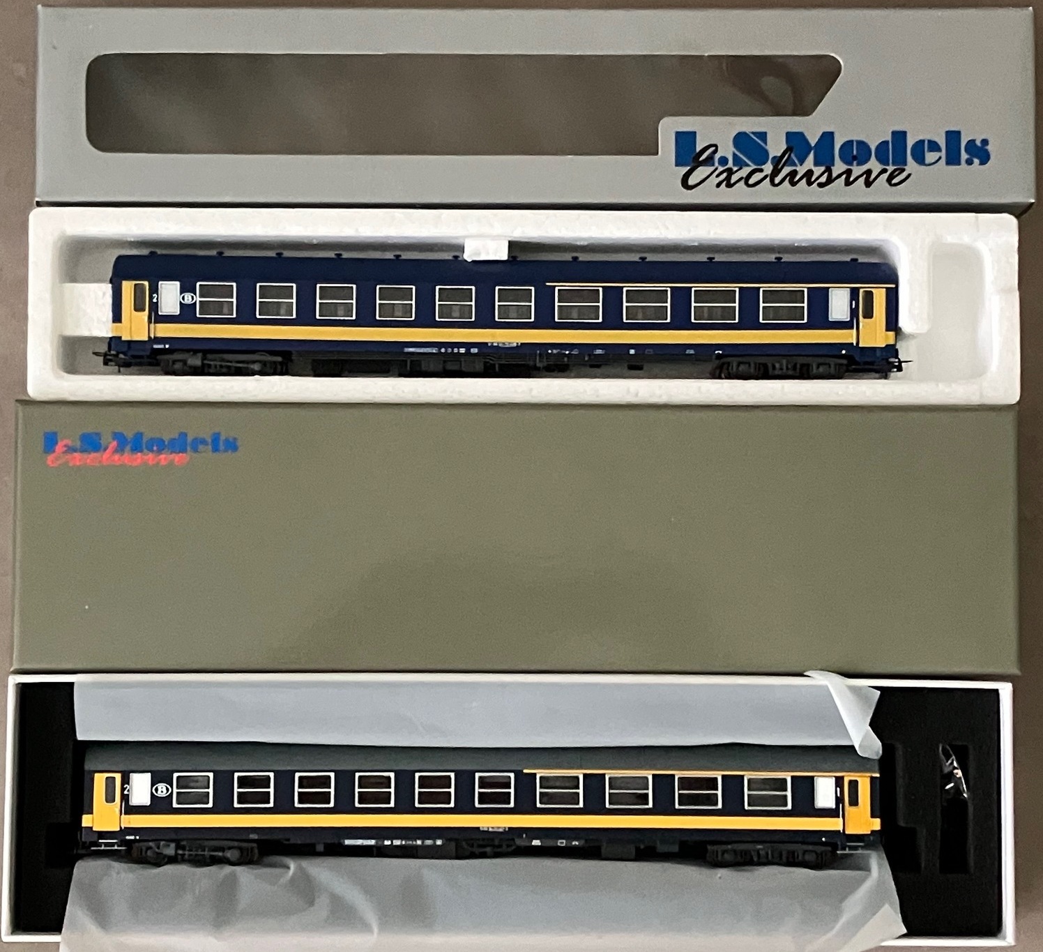 De nieuwe LS Models "oude" Benelux NMBS I4 A en AB rijtuigen, hier de versie met grijs dak.