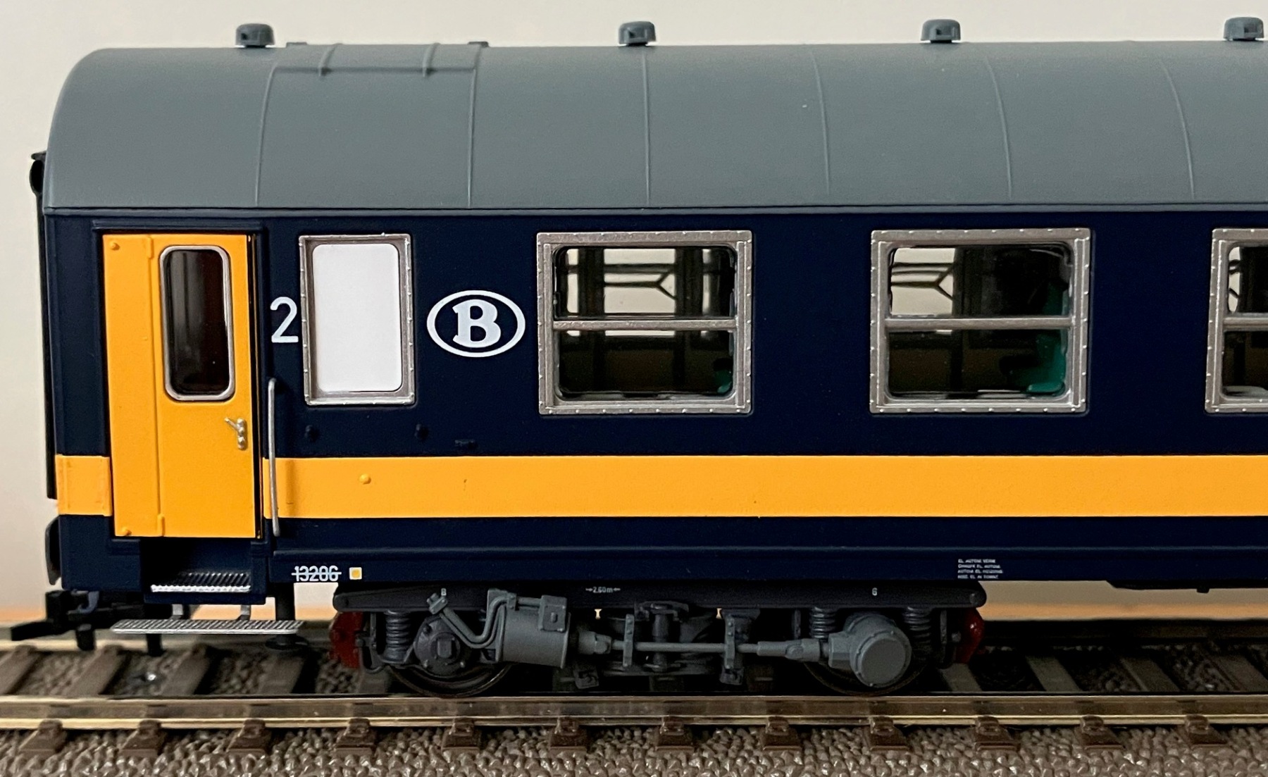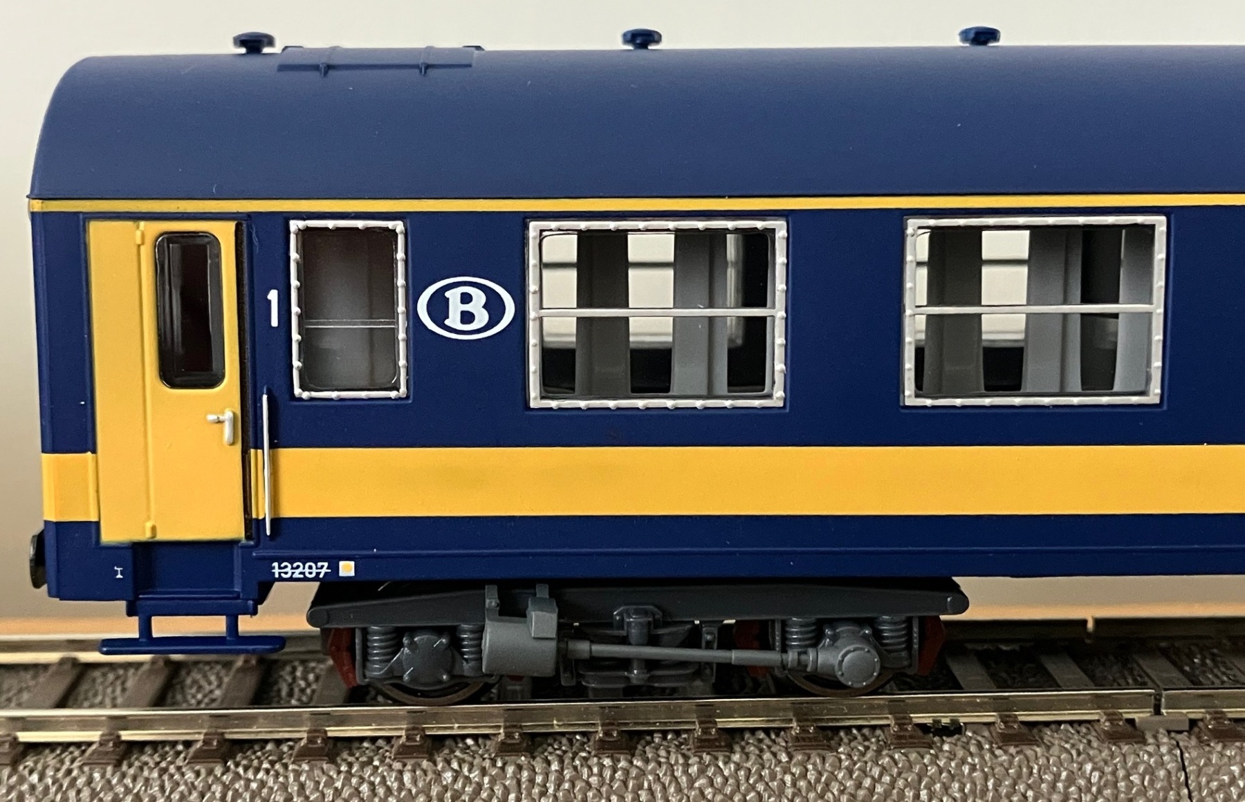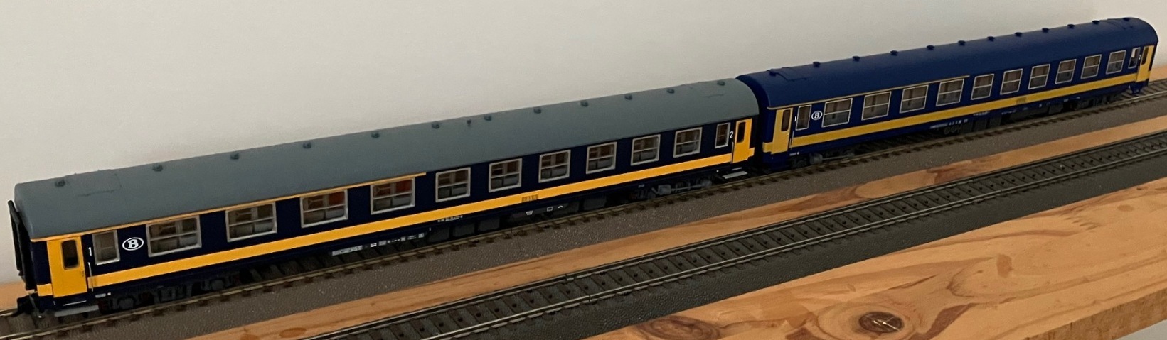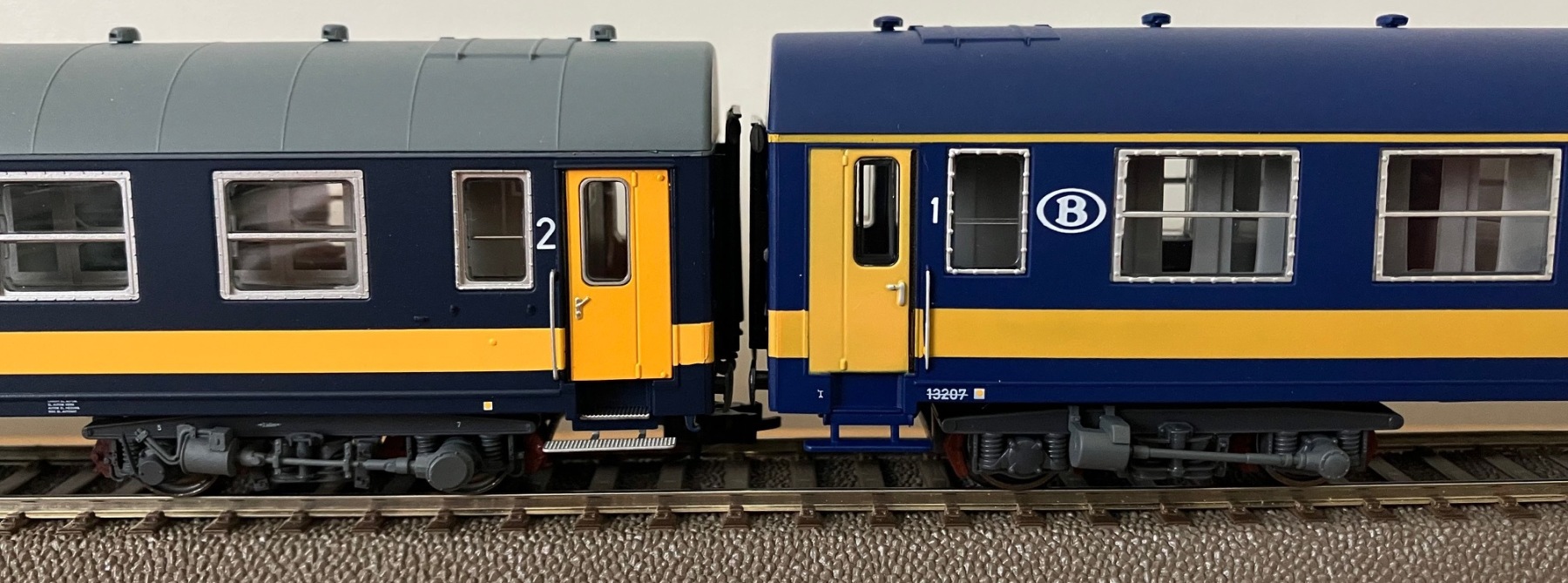 De nieuwe LS Models "oude" Benelux NMBS I4 A en AB rijtuigen, hier de versie met grijs dak.