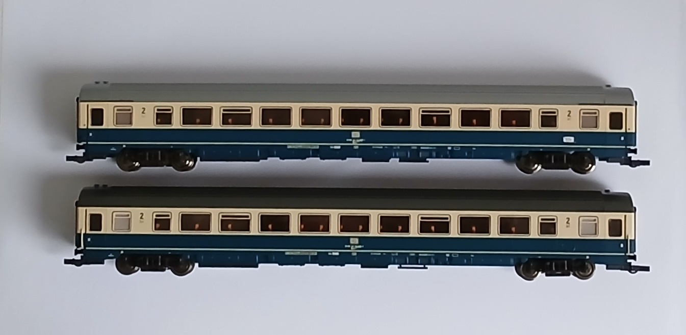 Ik begrijp trouwens niet waarom Piko zo 'moelijk' loopt te doen over RVS-daken van de seriewagens. Eveneens in het kader van IC-79 waren in 2023 voor spoor N de 40664 en 40665 aangekondigd. Beide Bpmz, de 64 met RVS en de 65 met Umbragrau. Het werden allebei serie rijtuigen met Umbra... En dat terwijl de Merkurset (40672) uitstekend gespoten zilvergrijze daken kreeg. Dat zilvergrijs had goed voor Edelstahl door kunnen gaan op de 40662...  :-\