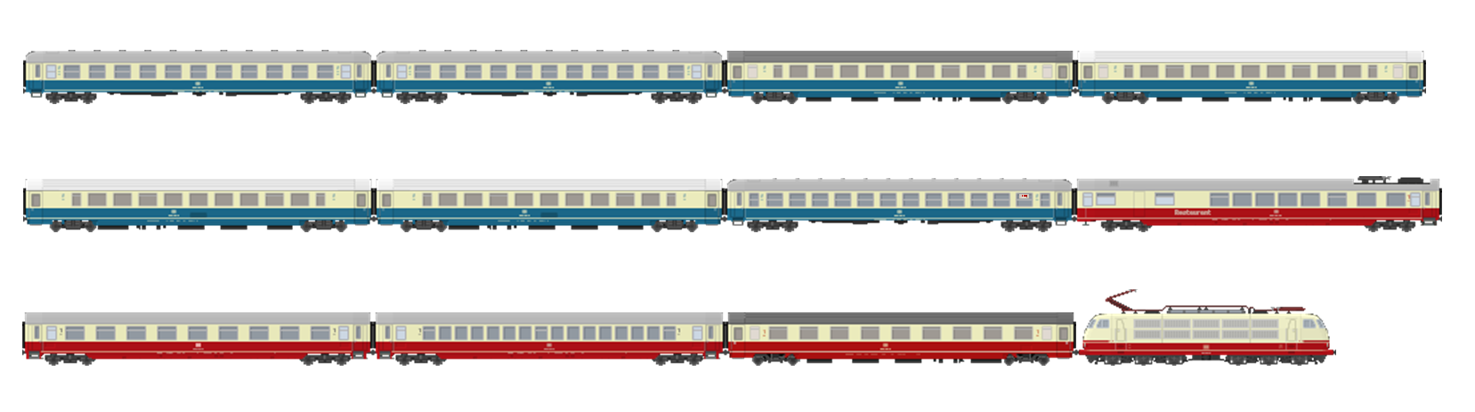 De samenstelling is inmiddels iets veranderd(gemoderniseerd) en verbeterd(de Lima rijtuigen hebben plaatsgemaakt voor Roco: