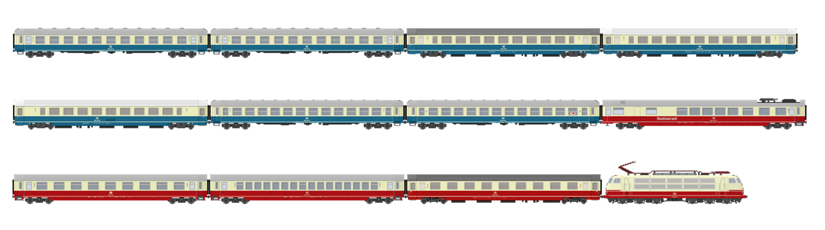 Naast 2 Piko's heb ik zelf ook nog een gepimpte Fleischmann 103 van de laatste modelserie (dus met buffers op de juiste hoogte). Die vind ik persoonlijk ook beter smoelen dan de Roco, zeker als je de ruiten met aangegoten niet kloppende ruitenwissers vervangt door goed passende ramen van de Marklin 103 (met aangegoten juiste ruitenwissers)