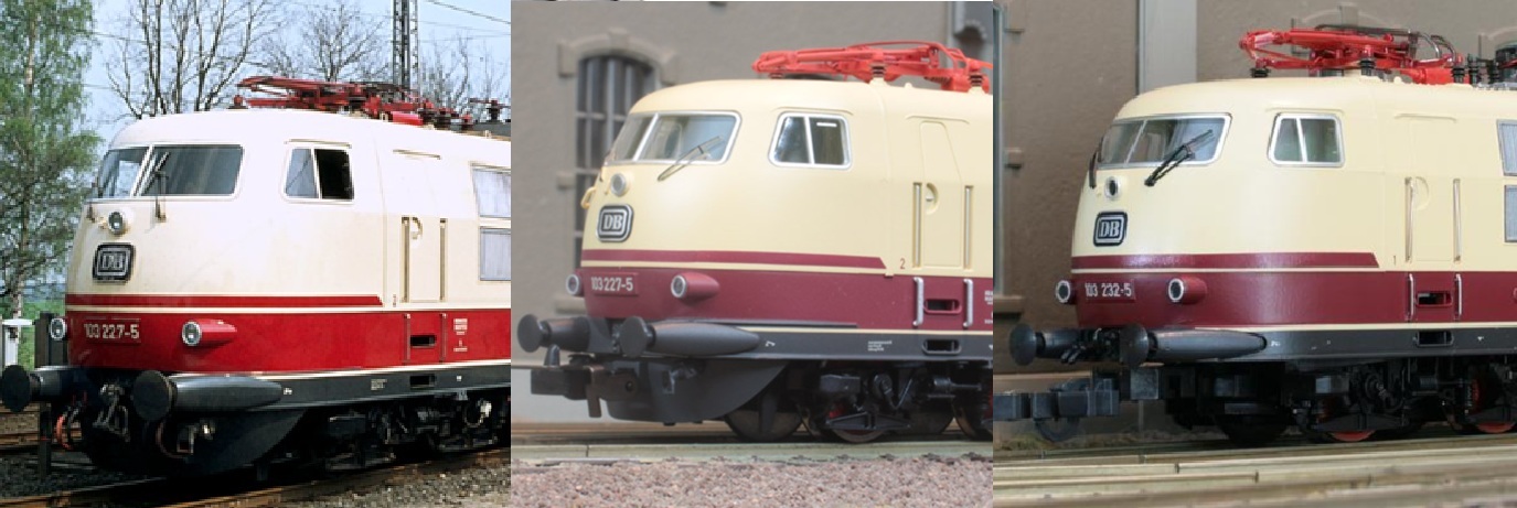 Naast 2 Piko's heb ik zelf ook nog een gepimpte Fleischmann 103 van de laatste modelserie (dus met buffers op de juiste hoogte). Die vind ik persoonlijk ook beter smoelen dan de Roco, zeker als je de ruiten met aangegoten niet kloppende ruitenwissers vervangt door goed passende ramen van de Marklin 103 (met aangegoten juiste ruitenwissers)