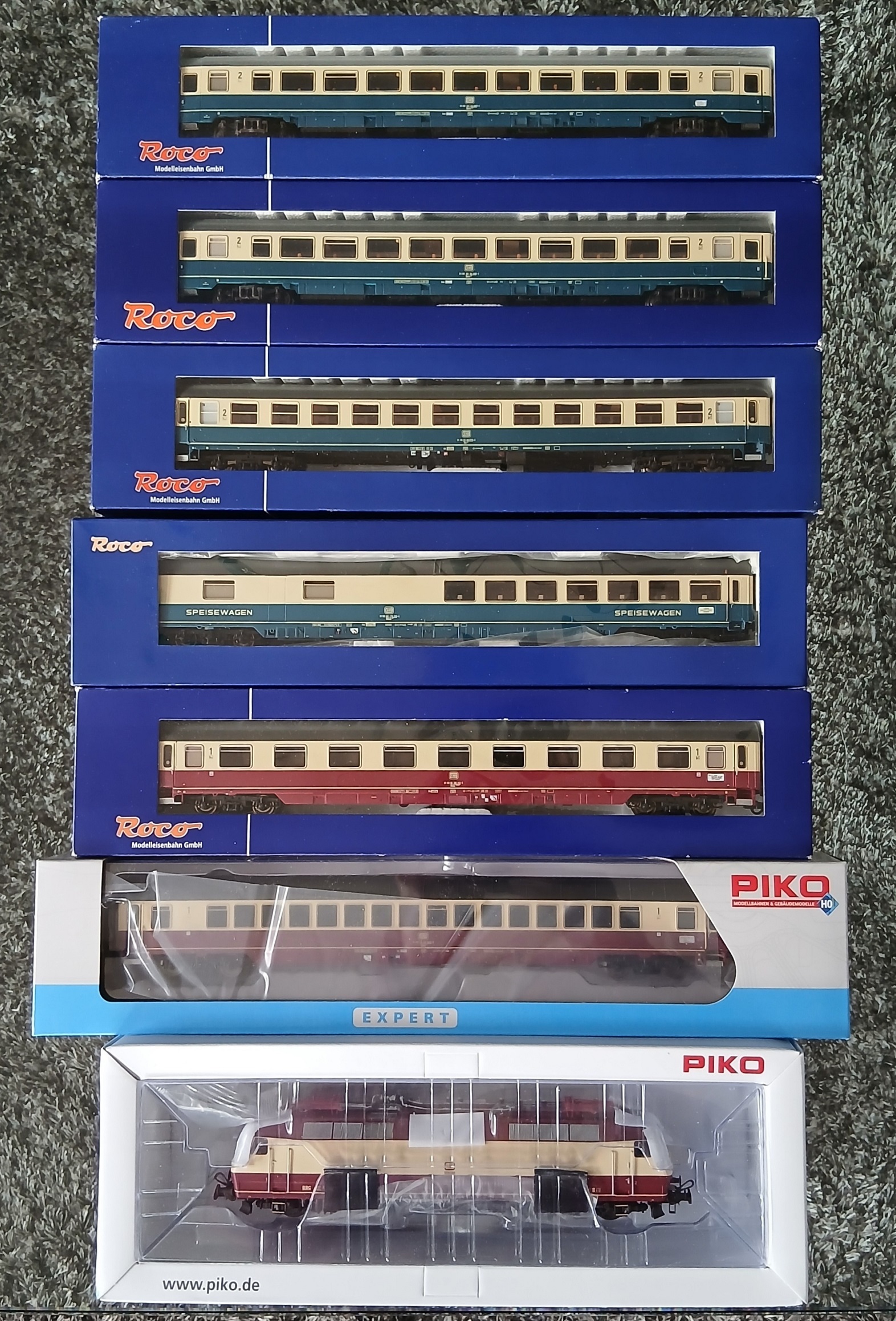 De vleugel IC 4A is van de baan, het wordt een ingekorte IC tussen München en Nürnberg ca. 1982 met een rijtuigsamenstelling die ook door zou kunnen gaan voor de Erasmus/Rembrandt op het NL trajectdeel. De Piko Apmz121 is voor de foto geleend van de IC-79, maar eind februari/begin maart verwacht ik de definitieve. Deze is ook van Piko en hiervan ga ik de intrekbare traptreden vervangen door de meegeleverde statische exemplaren. De intrekbare gaan dan naar de ARmz211 van de IC-79. De 120 004 is van Piko, ik vond op Ebay een nieuwe met sound voor een leuk prijsje. De trein komt niet in mijn vitrine maar op een modelbaan van een vriend te rijden, die ook eigenaar is van het tapijt dat onder de dozen ligt. Het betreft een trein in gezamenlijke eigendom.