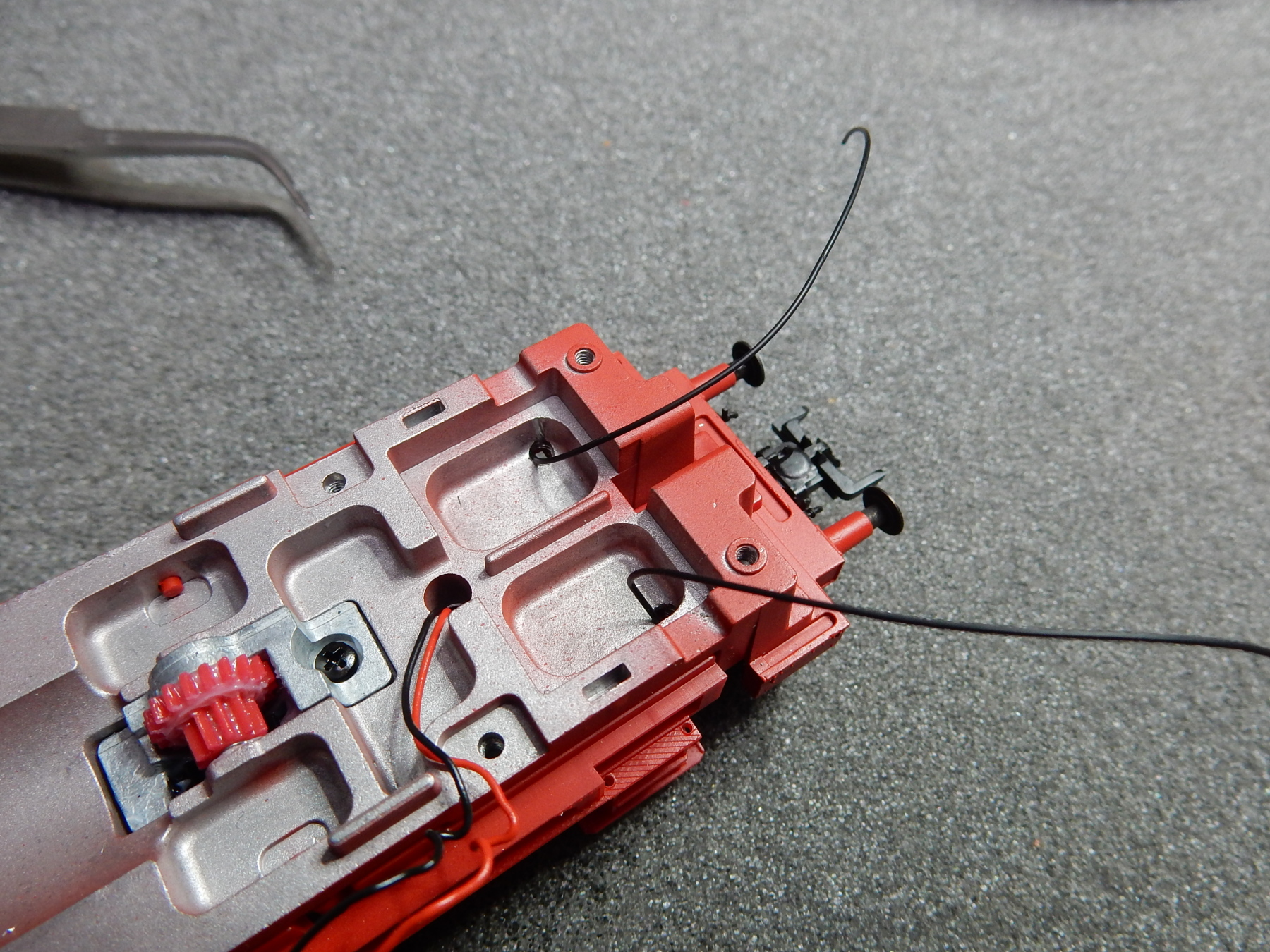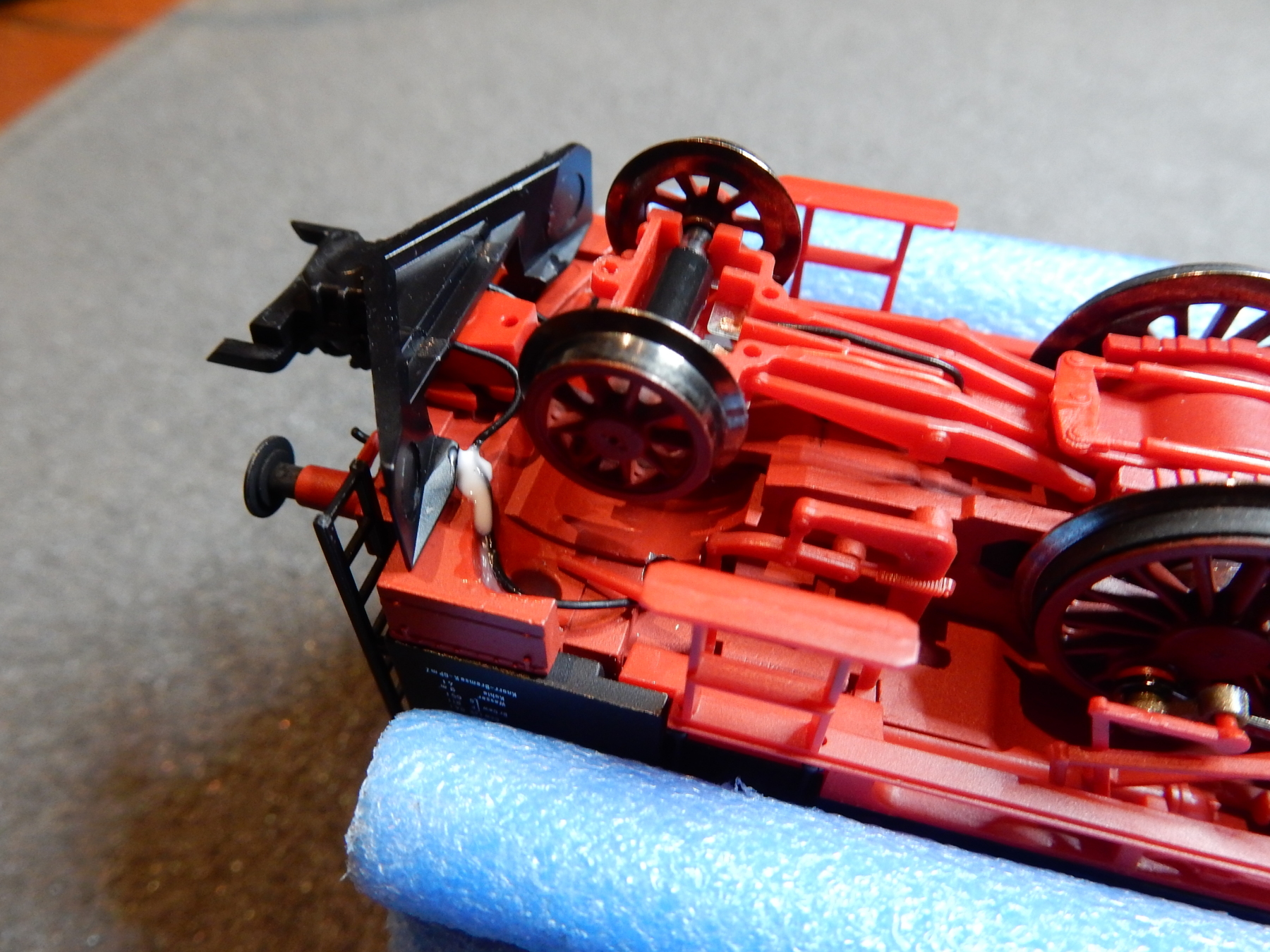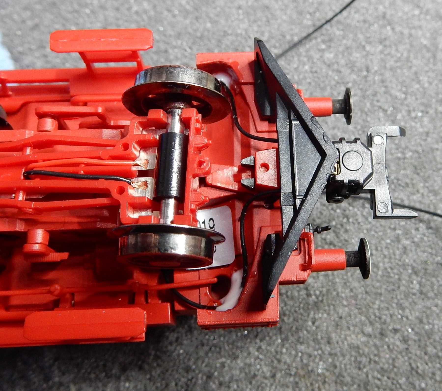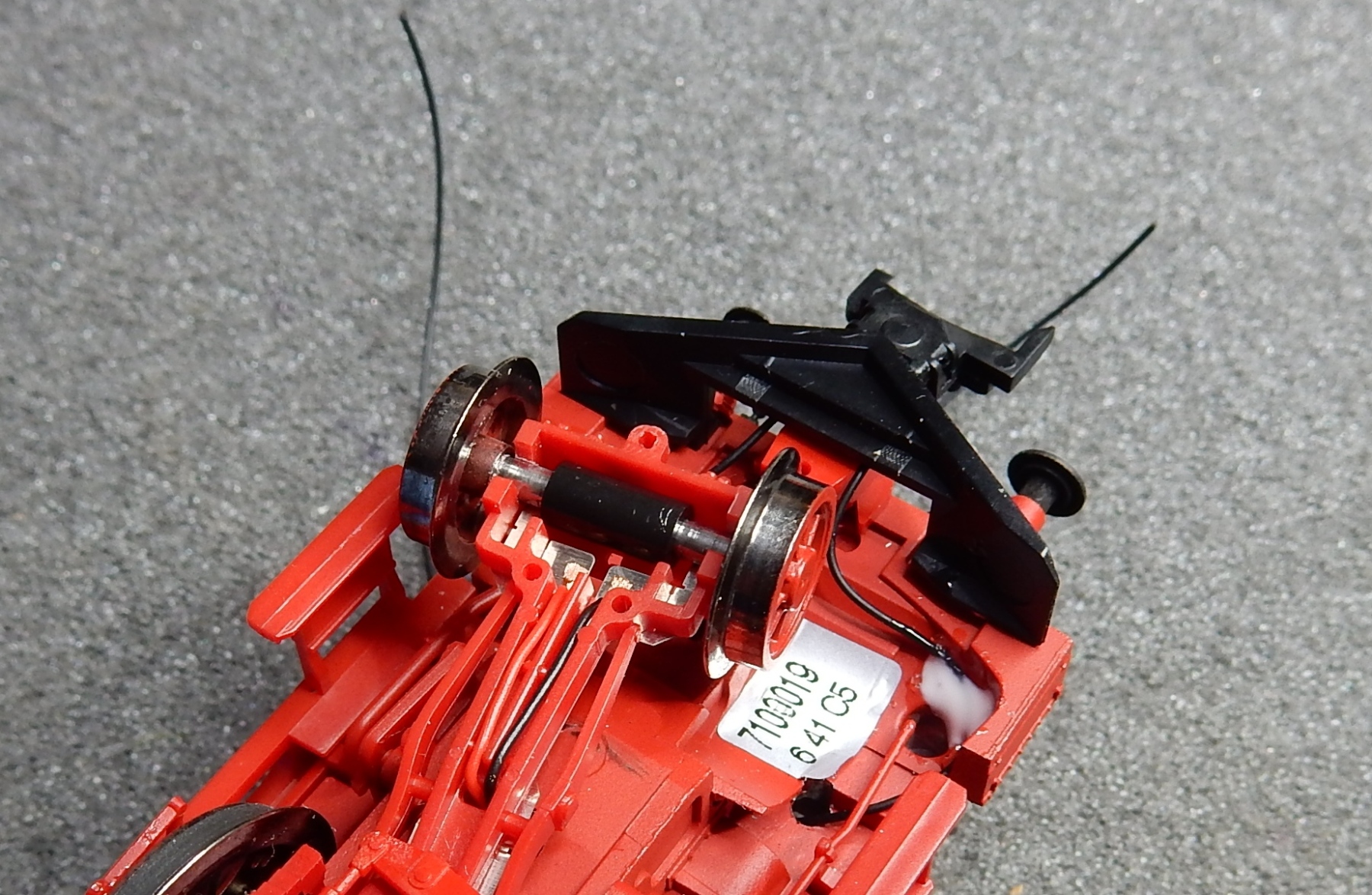 ..... en dat is twee gaatjes boren op een plek die me eigenlijk niet uitkomt want net boven de wielen van de voorloop as. Maar ik heb geen keus en het gaat en de kunst is te zorgen dat de draadjes de wielen niet kunnen raken. Dat lukt met wat druppies Kristal Klear wat af en toe even moet drogen voor ik verder kan.