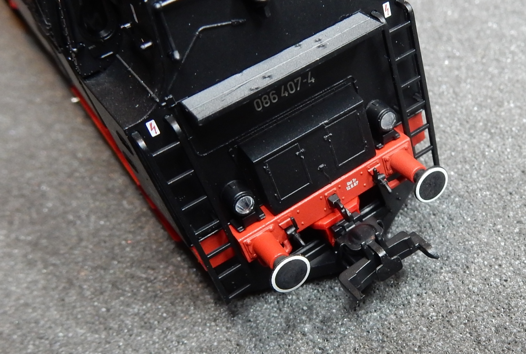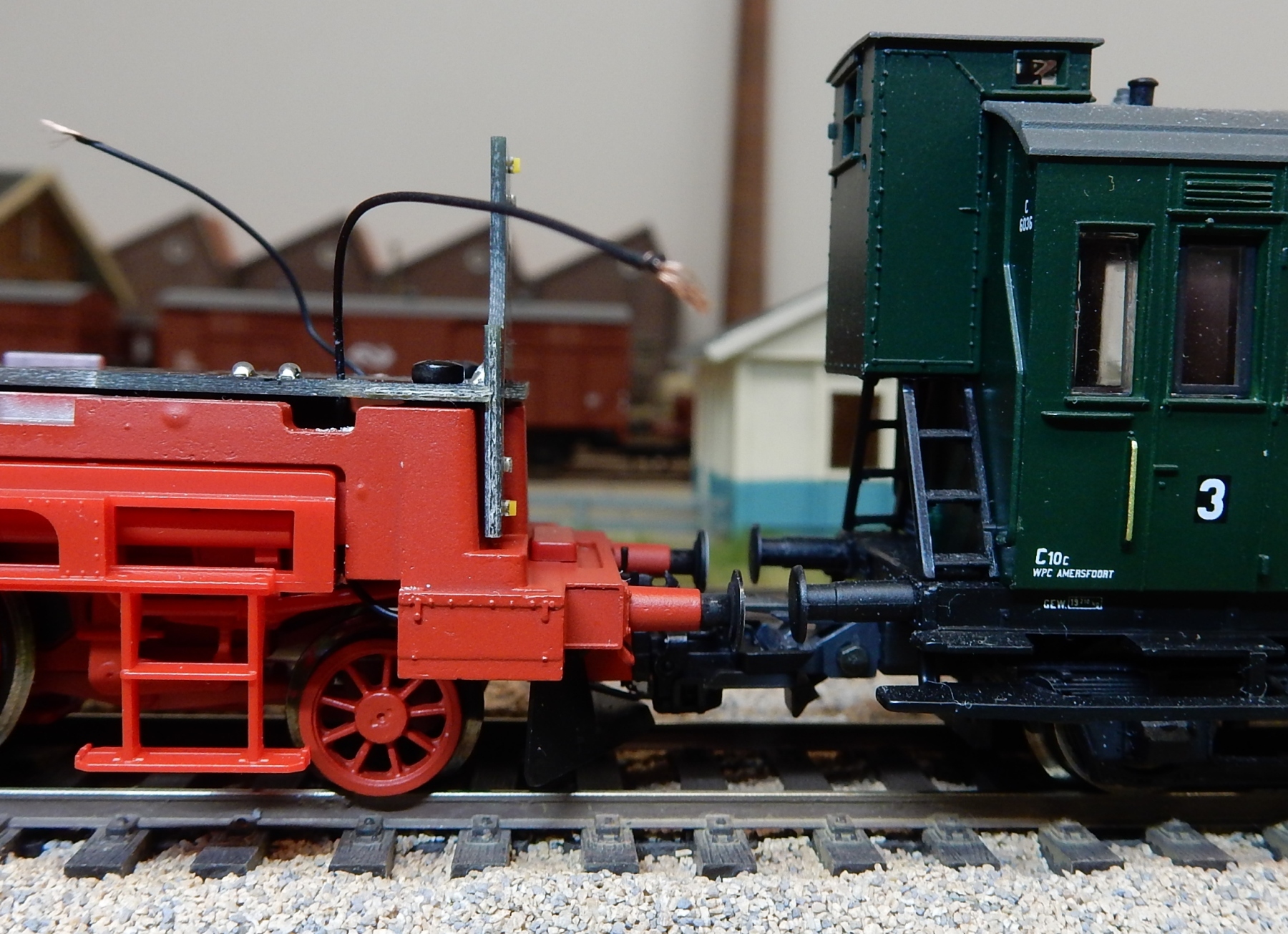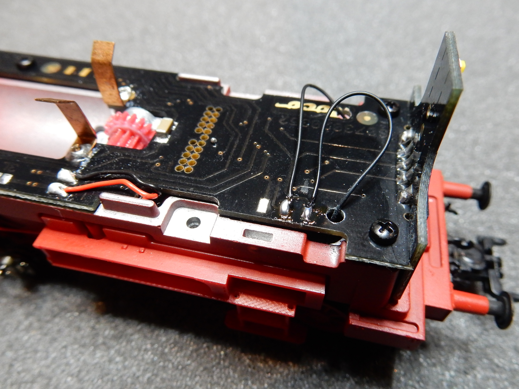Even proefpassen aan een rijtuig want de koppeling is in hoogte verstelbaar en na het solderen van de twee draadjes op de soldeerpads van de dragerprint (Aux5 en V+ zegt de handleiding van het lokje) kan de boel weer in elkaar.