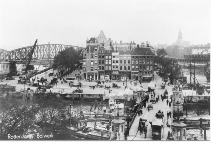 Op de achtergrond links de Maasbruggen. Op de achtergrond rechts het begin van het Luchtspoor (de middenpijler van de draaibrug daar staat er nog altijd, al weet bijna niemand waar precies...