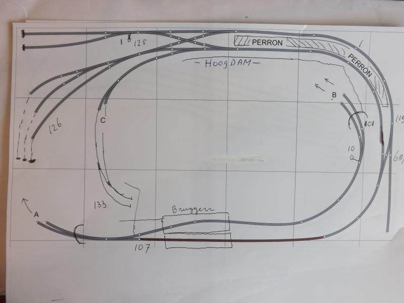 Ik heb het in Anyrail uitgetekend in de probeerversie,als H0 baan op een ruimte van de helft v d zolder. Rail is van Roco. Maar het komt wel duidelijk over.