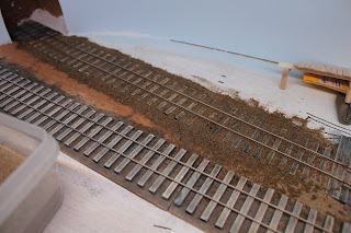 Nee, je ballast moet al perfect liggen. Droog strooien, met een kwast op z'n plek vegen en dan sprayen met een oplossing die alcohol of een drupje sop (breekt de opppervlaktespanning) bevat. Op het moment dat je dan gaat indruppelen met verdunde lijm (ook weer met een beetje sop) vloeit het mooi tussen je ballast zonder dat het gaat samenklonteren. Vooral wanneer je lokaalspoor met zand aanlegt, grindballast blijft wel liggen.