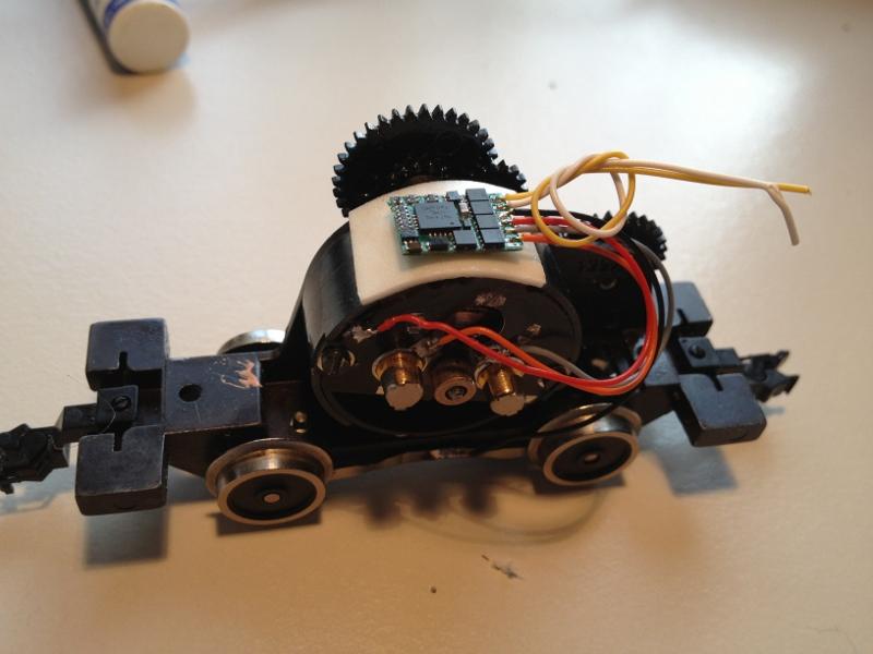 Vandaag de Kuehn N45 lok-decoder ontvangen. Een heel klein dingetje (is ook een microdecoder). Het oude metalen motorschild gedemonteerd en het nieuwe geïsoleerde motorschild gemonteerd. De condensatoren er af gehaald (met de soldeerbout ging niet, dus met een tangetje er af gebroken). Daarna de decoder volgens aanwijzingen van Martijn gesoldeerd met dit als resultaat: