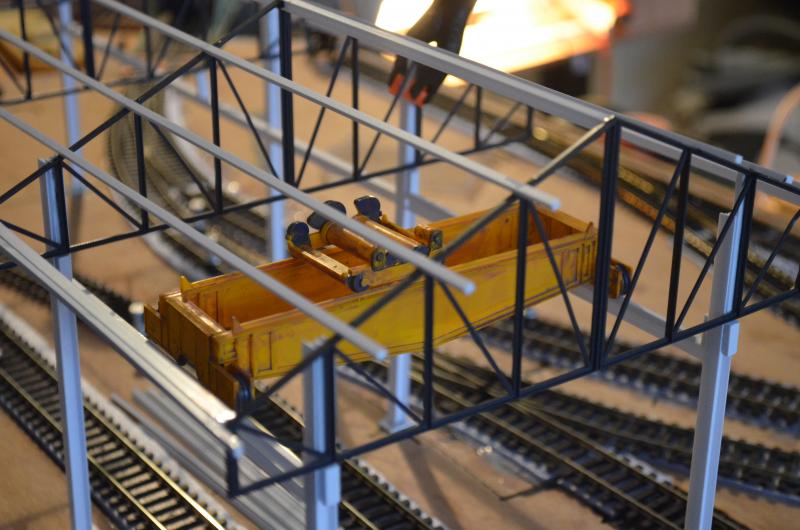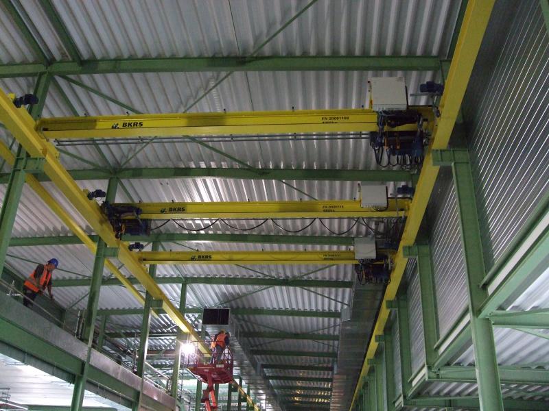 Er zijn hier in totaal 3 kranen, omdat de hal, en dus ook de kraanbaan, 170 meter lang is.