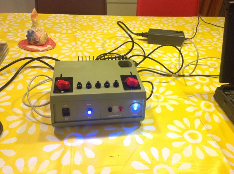 Alles met de zenuwen in de keel aangesloten, maar het werkt volgens mij prima. De blauwe led bij 'luft' is de 'power on' indicator. De twee leds bij 'filter' zijn aangesloten op het uitgangssignaal. Ze gaan aan en uit met de spatiebalk in MRDirect dus ik vermoed dat het allemaal gewoon werkt.