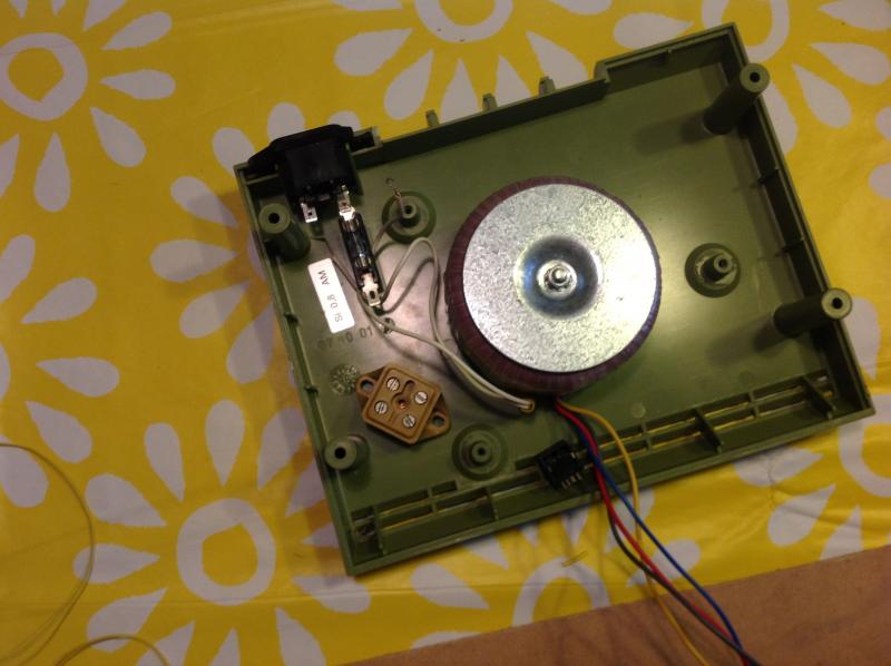Dan de nieuwe inhoud. Ik heb ooit een vaag apparaat uit een container 'gered' waar een Amplimo ringkerntrafo in zat met 18 volt 3A secundair. Ideaal voor dit project: