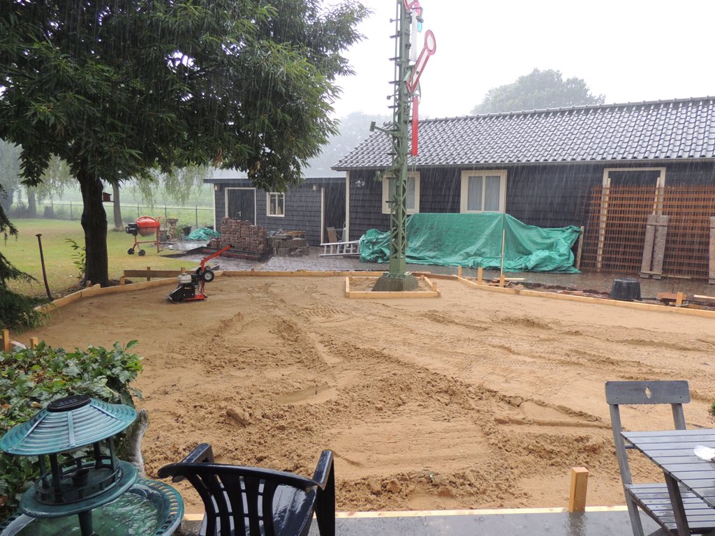 Een beetje regen op het zand kan geen kwaad. Dan klinkt het zand lekker in.