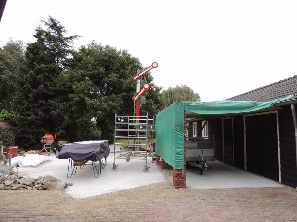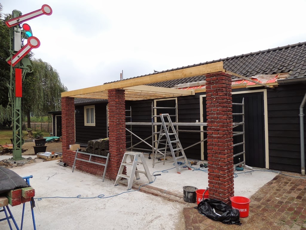 Volgens de tekening komen er tussen de seinpaal en de overkapping drie sporen te liggen (twee inhaalsporen en een kopspoortje). Op de laatste foto zie ik die ruimte niet, lijkt me te krap voor drie sporen.